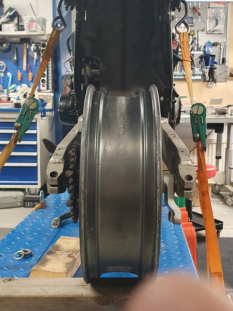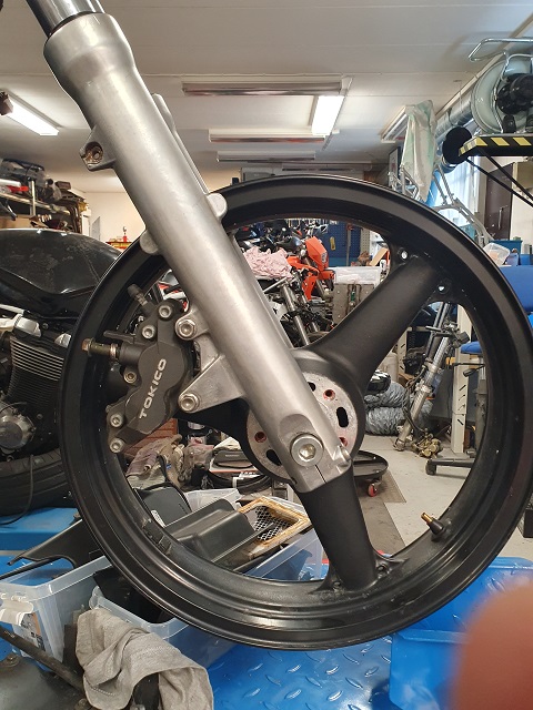 So now I have yet one more hose real made in Japan and a second ZXR400 rear wheel and that solved everything, of course I will have to remake the spacers, but that what our old Blomqvist lathe is for.