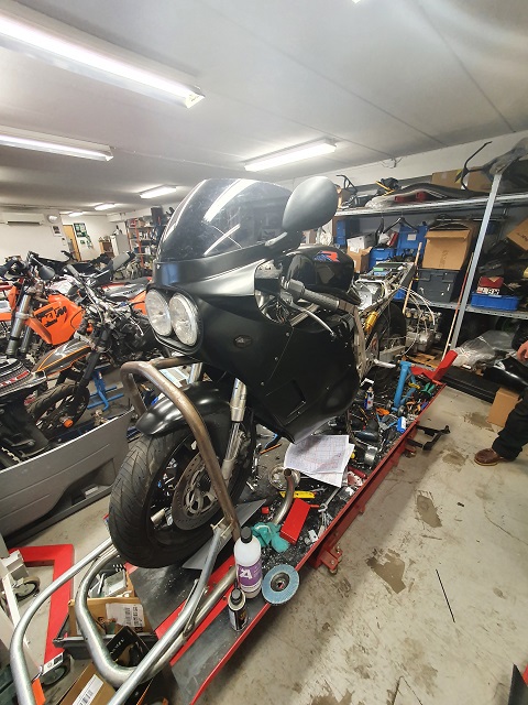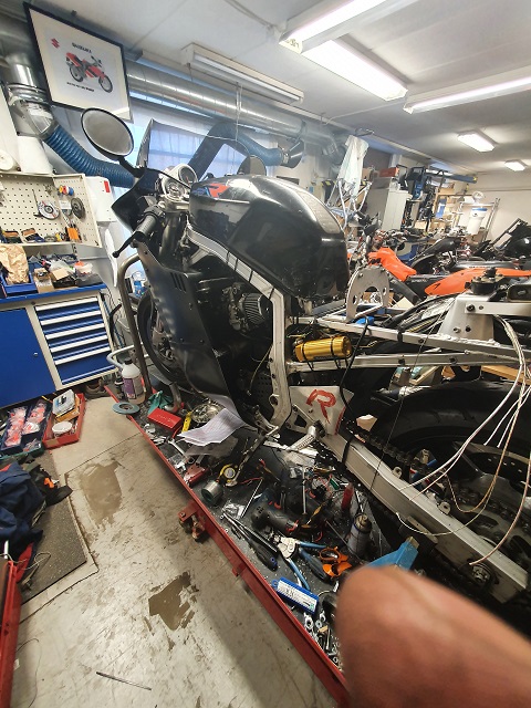 There is some nice bikes and some barn finds in the background of the picture, unfortunately no Kawasaki’s, there is Stefan’s GSX-R1100 build on the lift in the background, but also a nice Katana 1100 and a Harris CB900 (barnfind) and some other bikes at different stages of their build.