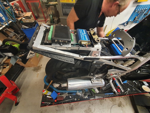 Fitted the swing arm back on and Suzuki Stefan dug up an old Gixxer shock from is endless stash of Suzuki parts.