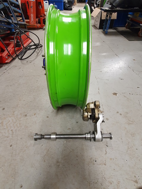 So I thought it would be a great idea to take both the front and rear wheel from a ZR-7 as I know that the ZR-7 front wheel fit like a charm in the Zephyr 1100 front fork. That way I would also get a 5’ rear wheel compared to the 4.5’ ZXR400 rear wheel I used on the Green Kwack.