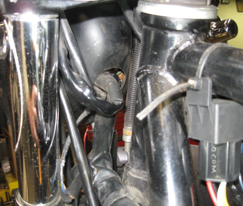 View forward from the left. Routing is factory. Ignore the relay under the top frame tube; it's the coil power bypass relay. That's just a handy, protected place to mount it.