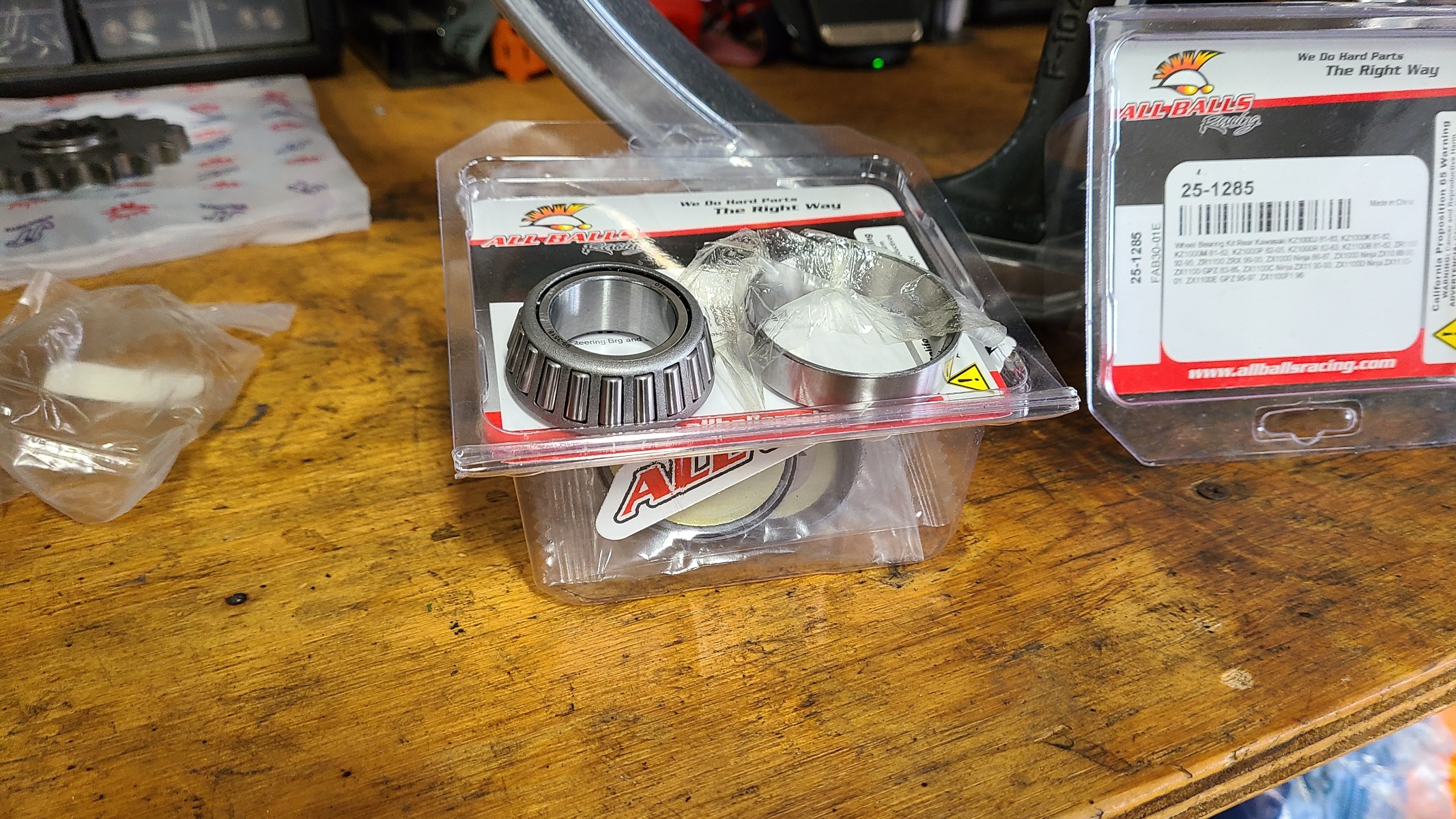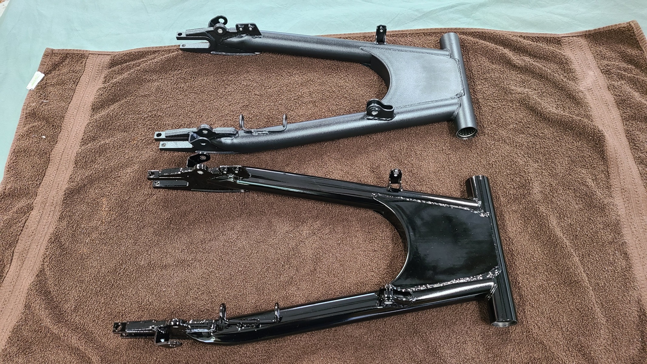 I have all the parts back from my powder coater and vapor blaster so I can start reassembling the bike and really determine what look I am going for. I had both frames done - the textured coated one is the LTD I originally purchased. The gloss coated one is the CSR I purchased as a parts bike. I'm definitely going to use the textured LTD frame and swing arm. All new All Balls Racing bearings for the bike. The wheels are at a shop getting fresh tires mounted as I type. Next step is to rebuild one set of forks and assemble a rolling chassis.