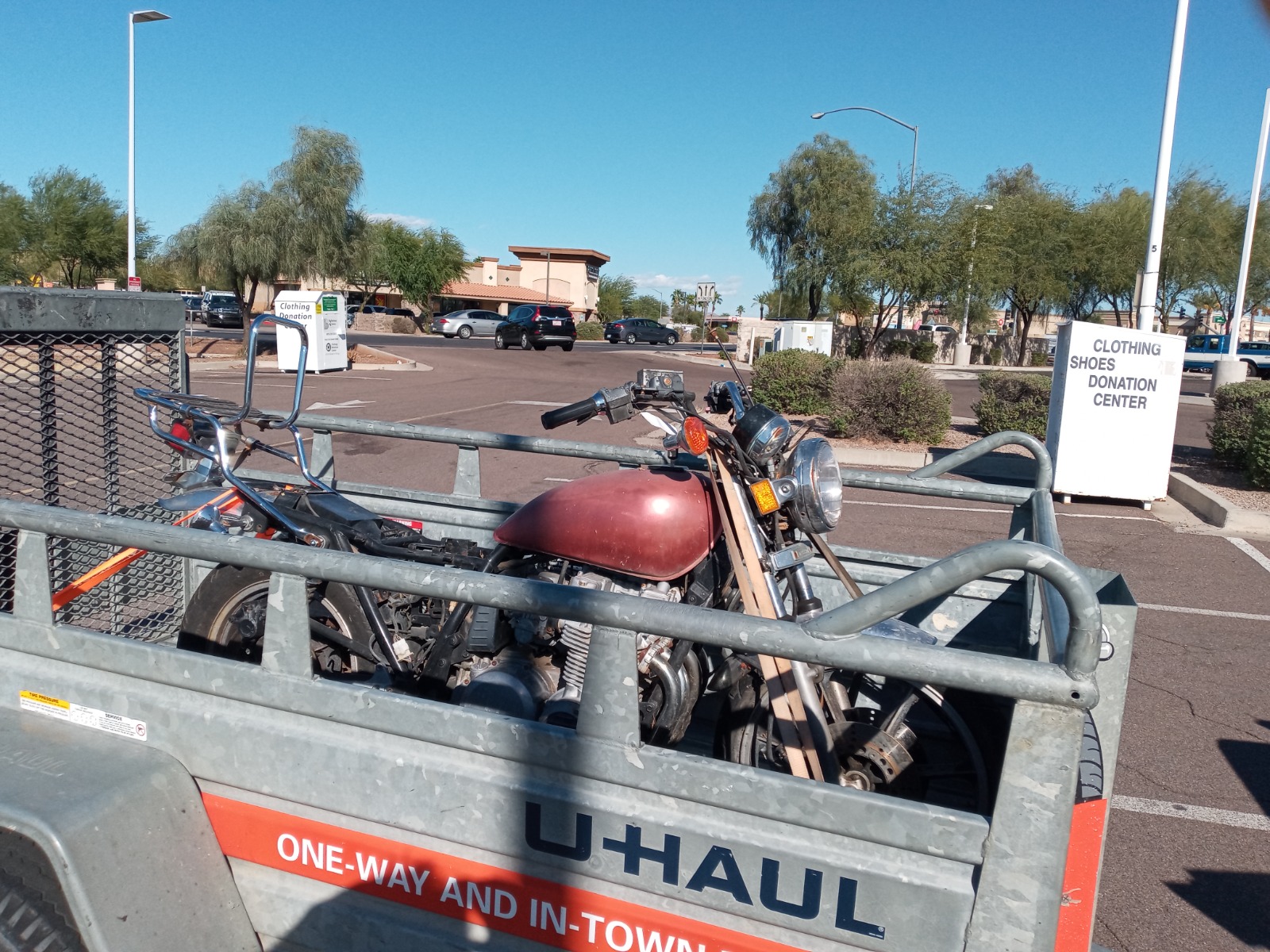 Got to Mesa AZ and got the rented trailer hooked up, no problem. The shop was just 2 blocks away. Pulled in and the KZ was pushed out. Now the shop bought this bike to part out and that might explain the missing parts. Starter, rear Lt turn signal with stalk and the Lt front foot rest and the rear fender is rusting away. It wouldn't shift out of first. So when the bike was pushed the engine turned over. Something was cluncking in there but, the engine was not locked up! The good news is I have all the major parts. Of course, all the rubber ( brake lines, tires and fuel lines) will need to be replaced. I opened up the tank and it's rusty and crusty on the inside. Luckily, I have a KZ 650 CSR parts bike and it's tank in very clean inside and It bolts right in. Oh yeah, the ignition coils and mounts are missing too. I have the mounts and some coils that can be used.