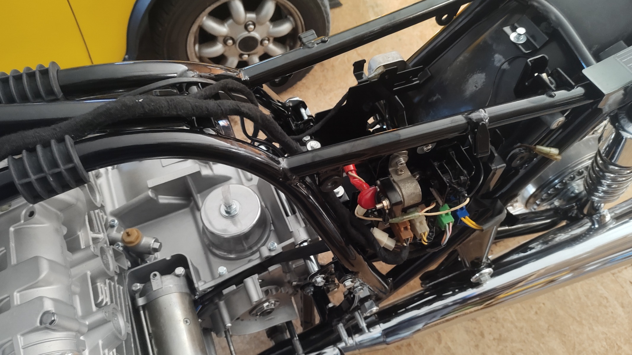 The harness goes under the brace where the tank elastic goes. Then wraps around the frame to the outside to get to the relay plate. The oval hole in the center brace is for the carb vent tubes