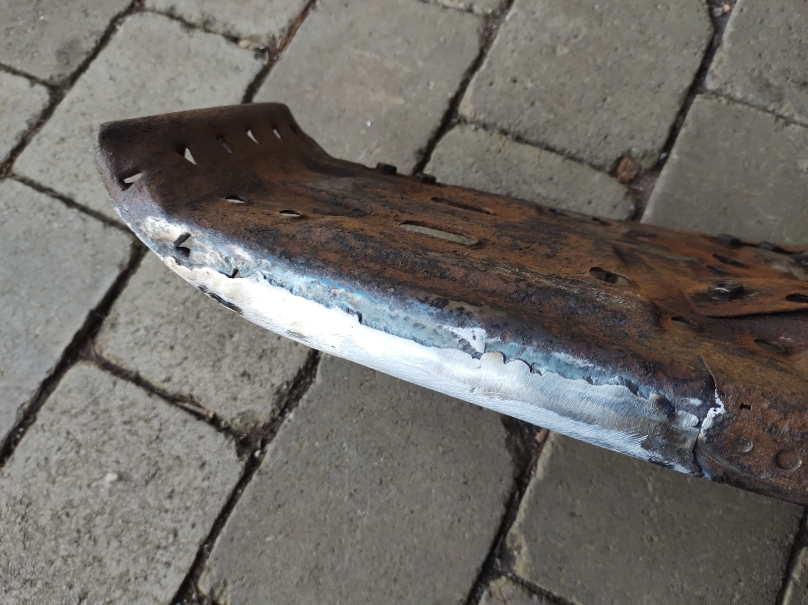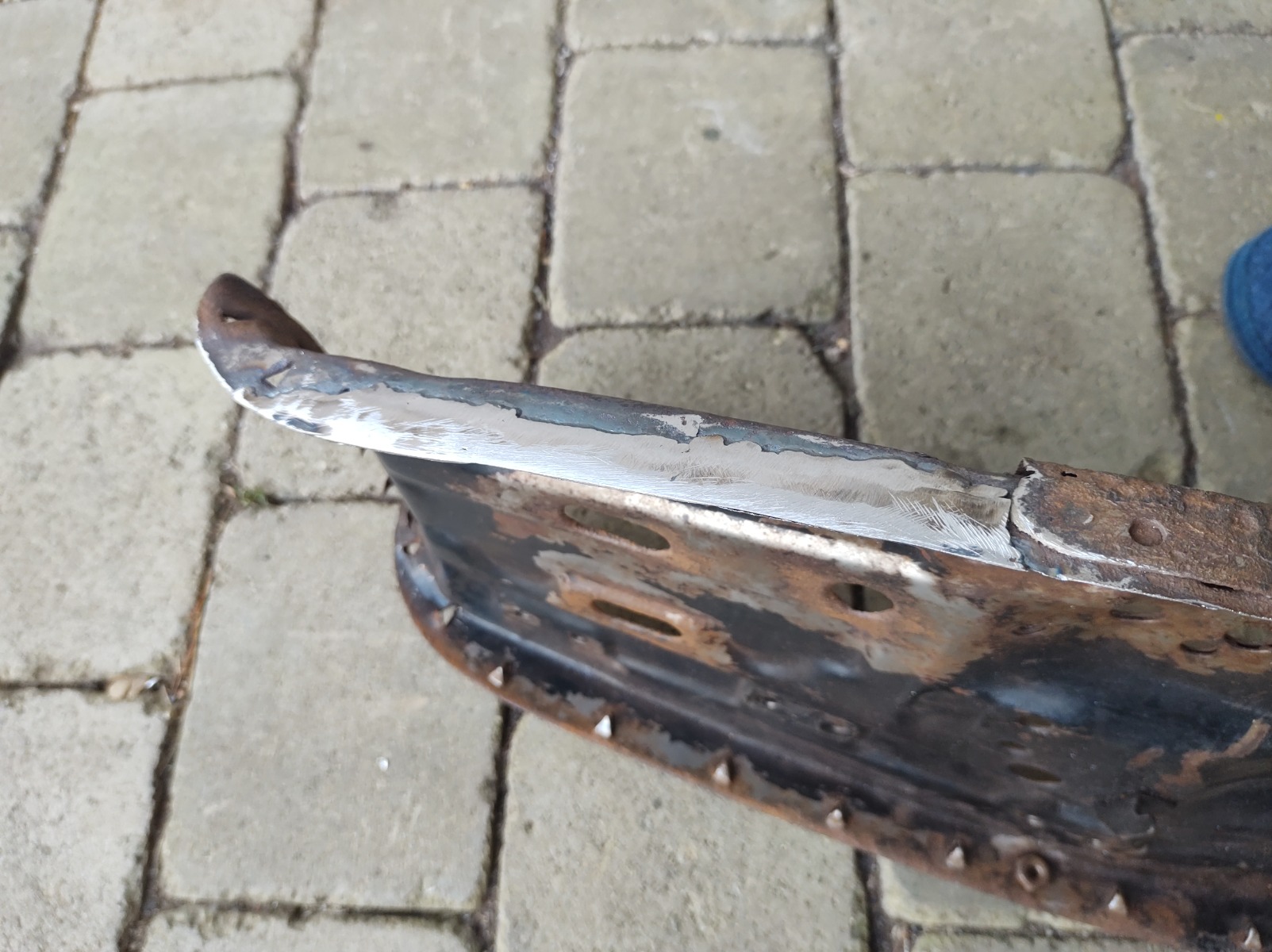 Did some repair work on the pan today. There are a couple of nicks furthur along the same edge, but the edge is solid so I'm just leaving it as is.