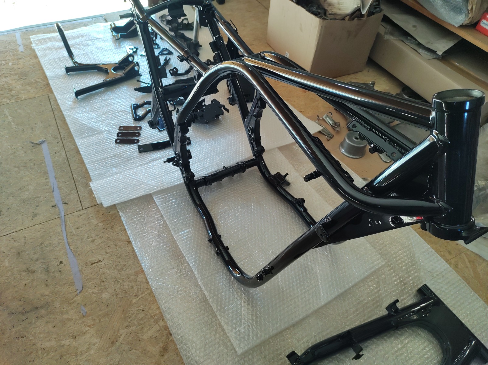 Got everything back from the powder coaters today. Went with the stock gloss finish (except the taillight bracket and top triples). Was a bit worried it would be too glossy but it is a very nice finish - not overdone. You can see the difference in the photo of the top and bottom triples.