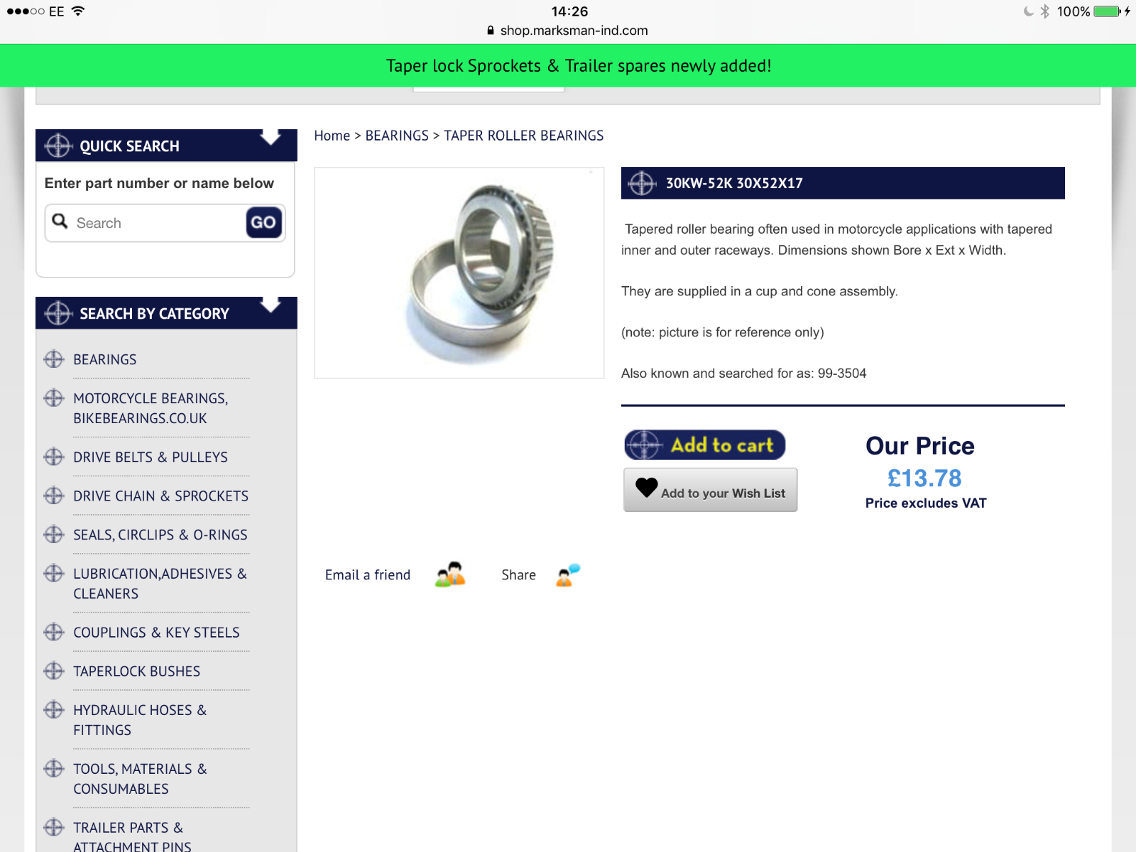 Hi Calum, you seem to be disappearing down a rabbit hole with what should be a fairly "straightforward" assembly. I have been looking through your thread and have found someting I think would be worth checking. From what I can see the bearing sizes areUpper 30x48x14Lower 30x52x17You mention on page 6 that the inner roller cage appears to sit 7-8mm too deep in the outer race. This does not sound at all right to me (I have never seen a tapered bearing sit this way)Is it possible that the kit you have been supplied has come with 2 top inner cages (would fit the stem the same as the ID of both bearings is 30mm) the smaller diameter and smaller depth of the top bearing would explain why your roller cage is sitting so deep in the bottom and giving you these problems. Please don't be insulted by the following suggestion as I am just trying to help - given the similarity in the size of top and bottom bearing, is it possible that you have accidentally got the top and bottom inner cages the wrong way round?If the sizes above are correct the bottom bearing is available separately from a decent bearing supplier (see below)