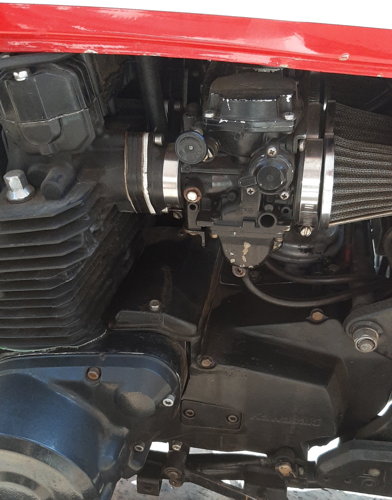 PO had removed the stock turn signals, the EFI and air-box (with inevitable butchering of the wiring! He mounted a set of Mikuni BS34's with some "cheap" pod filters, and some horrible "spacers" between the carb. boots and cylinder-head, presumably to create "space" for the oil pipes that pass between the head and carbs.