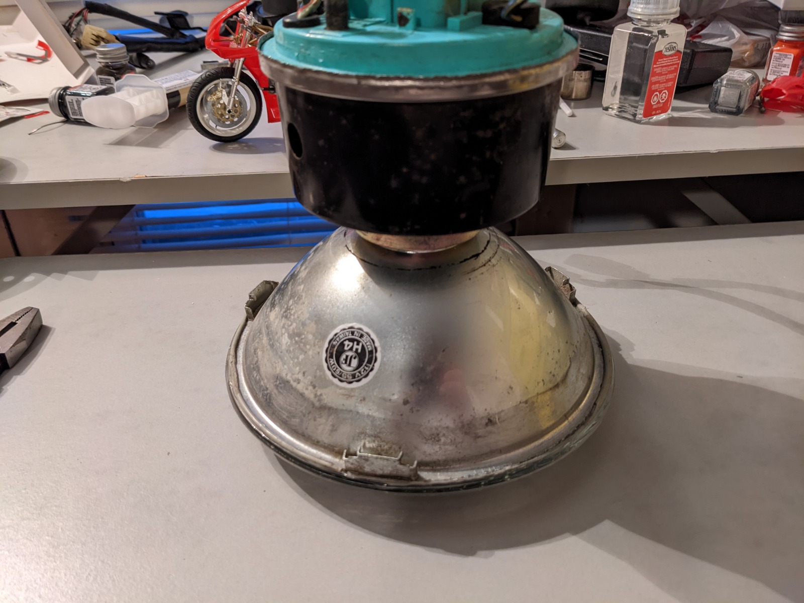 Old headlight was spiderwebbed with cracks and when I took my other one out of my Windjammer the glass popped off. I think I'm becoming an epoxy person... here's hoping I don't start putting RTV on everything too.