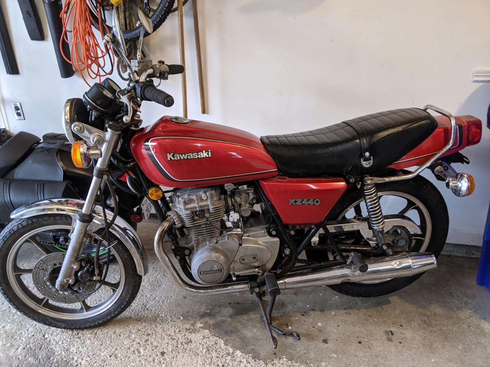 Last September I bought another bike to do a winter restoration project. It was bought in Southern Ontario Canada, and seemed to have been mostly from that area. First registered Ontario owner is Hurst Yamaha in 1984.While searching for parts for it, I was puzzled to not be able to find the exact model on any websites or Kawasaki parts breakdowns. In another thread, martin csr noted that Kawasaki only allowed parts breakdowns for Canada and US bikes. So I did some image searches and found 5 models of my bike for sale (4 red and one green) ......in Argentina! Wow. It must have been imported in the early 80's. It's a beautiful looking bike and now I know where to search for some chrome parts.Here are photos of each bike