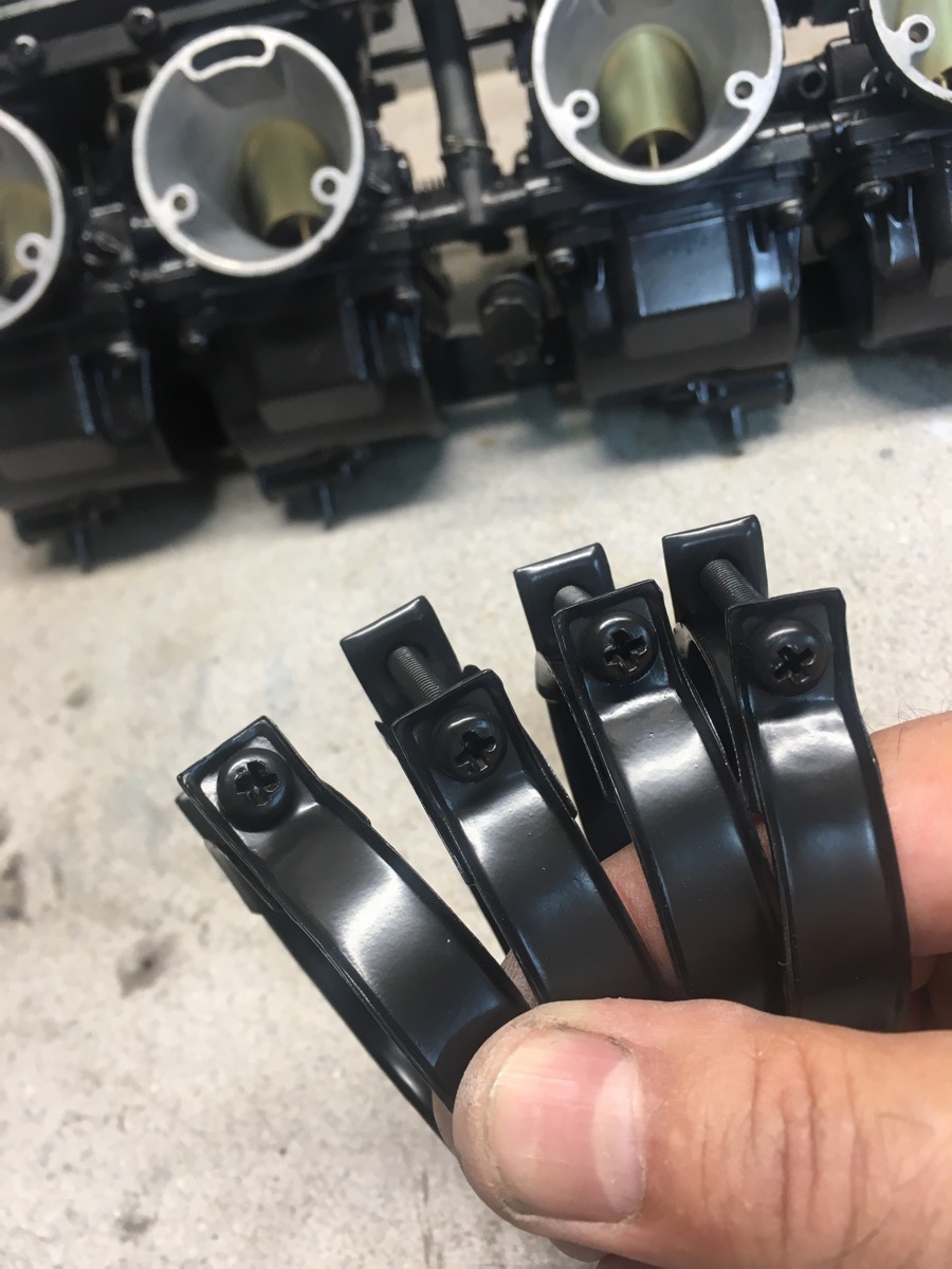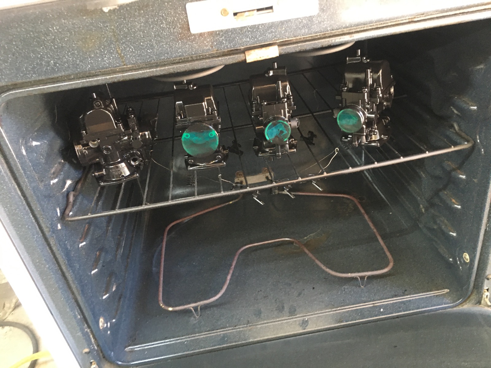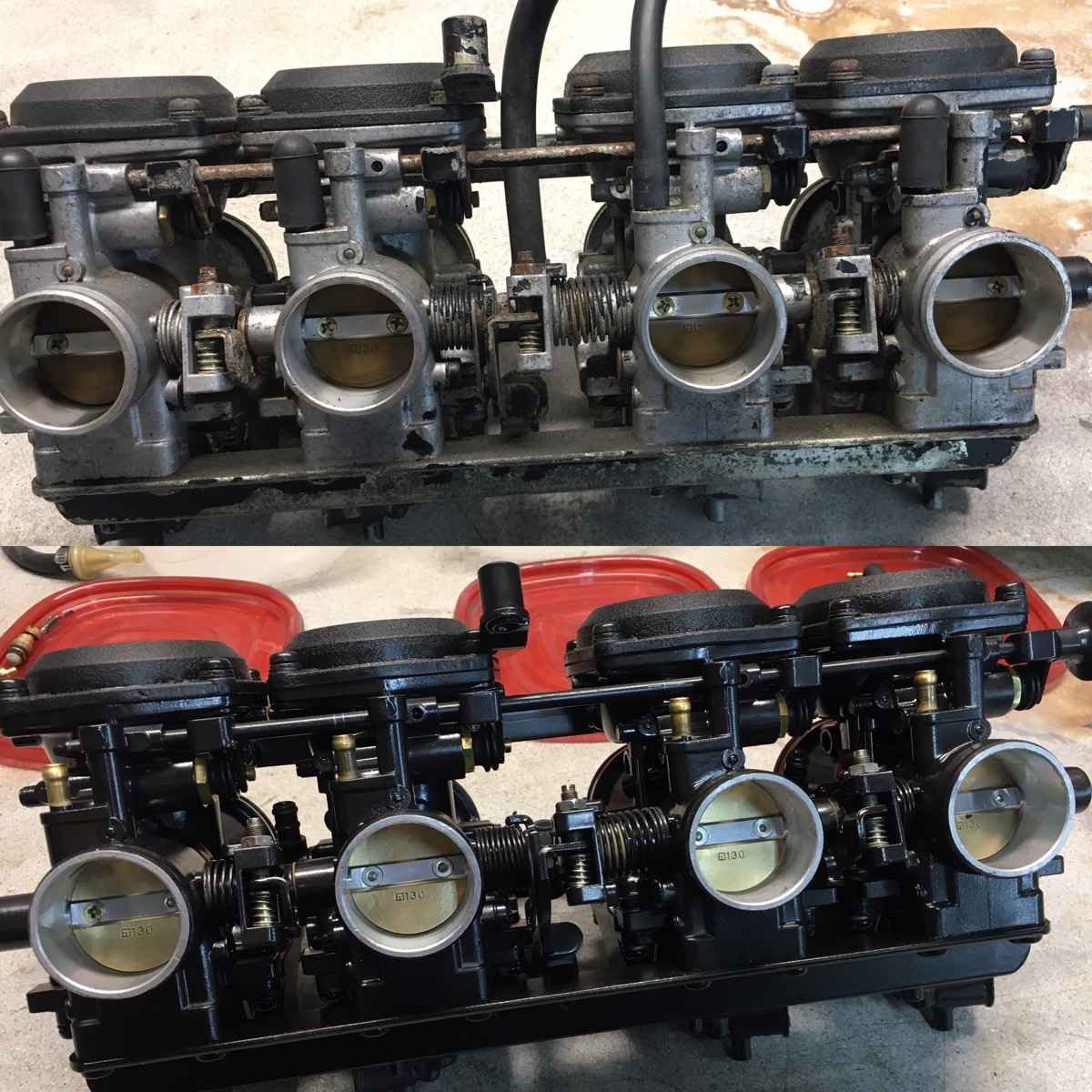 Well, on to the carbs. Sonic cleaned, glass beaded, cerakoted, rebuilt and reassembled...looks much better I think!