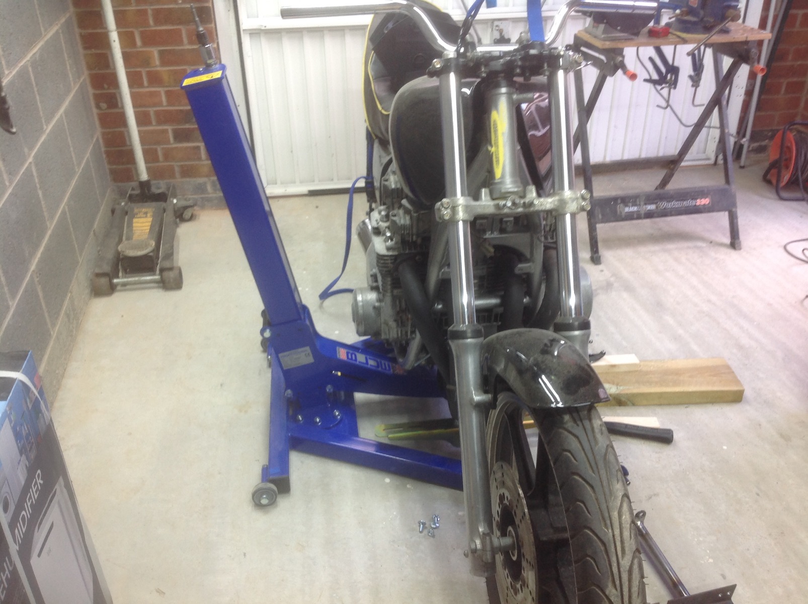 So since my first post at the back end of last year I have been feverishly clearing the backlog of jobs ( build bedroom furniture, Turbo blow up on my daily driver, yhada, yhada !) Finally I can get onto the bike. First job is to make some brackets for my lift. Space is an issue so a full table was out of the question (and most of the budget options are rubbish) but I don't want to crawl around on the floor any more. I came across this single post screw lift, I had some reservations but the company that make them is only 30 minutes from me so I went over and checked it out before buying.