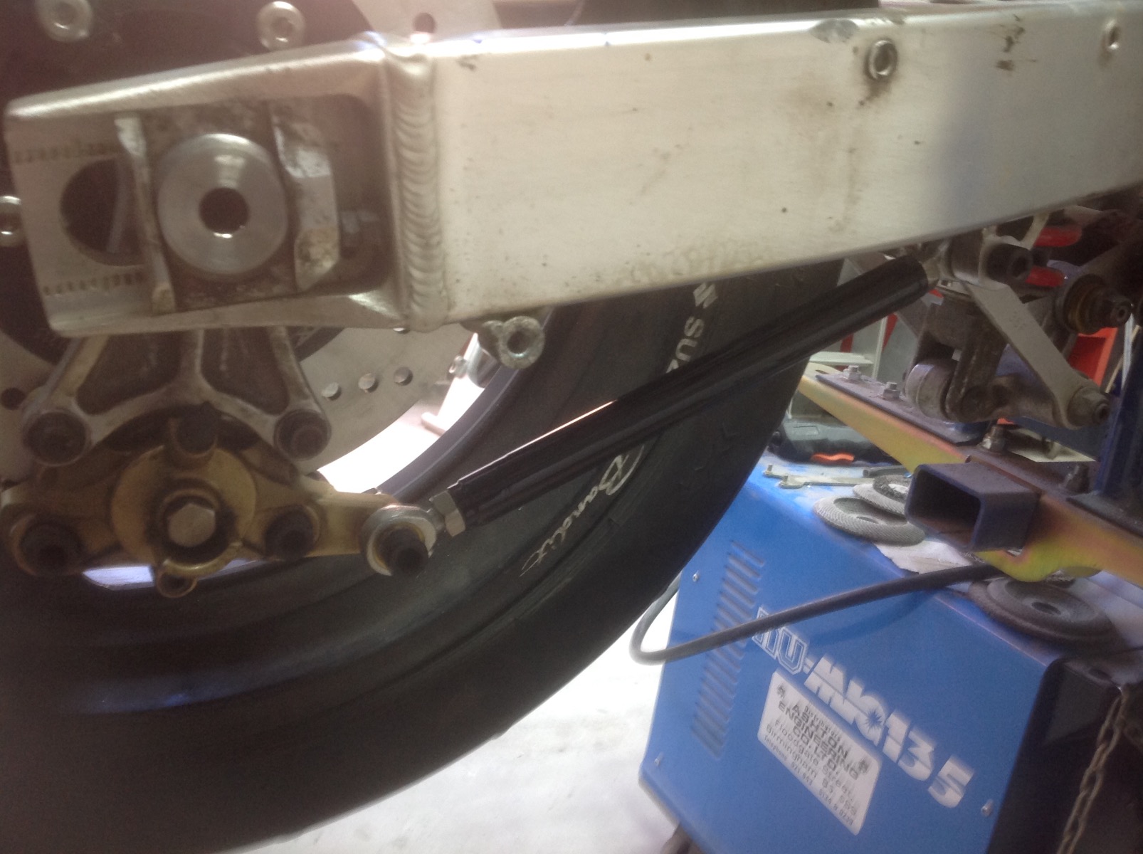 The two brackets just bolt to the "stand bobbins" on the GSXR swingarm. I then cut a spare Bandit axle to the same width as the wheel assembly so that I can fully assembly the back wheel on the floor (calliper, spacers etc) with the "assembly shaft installed.