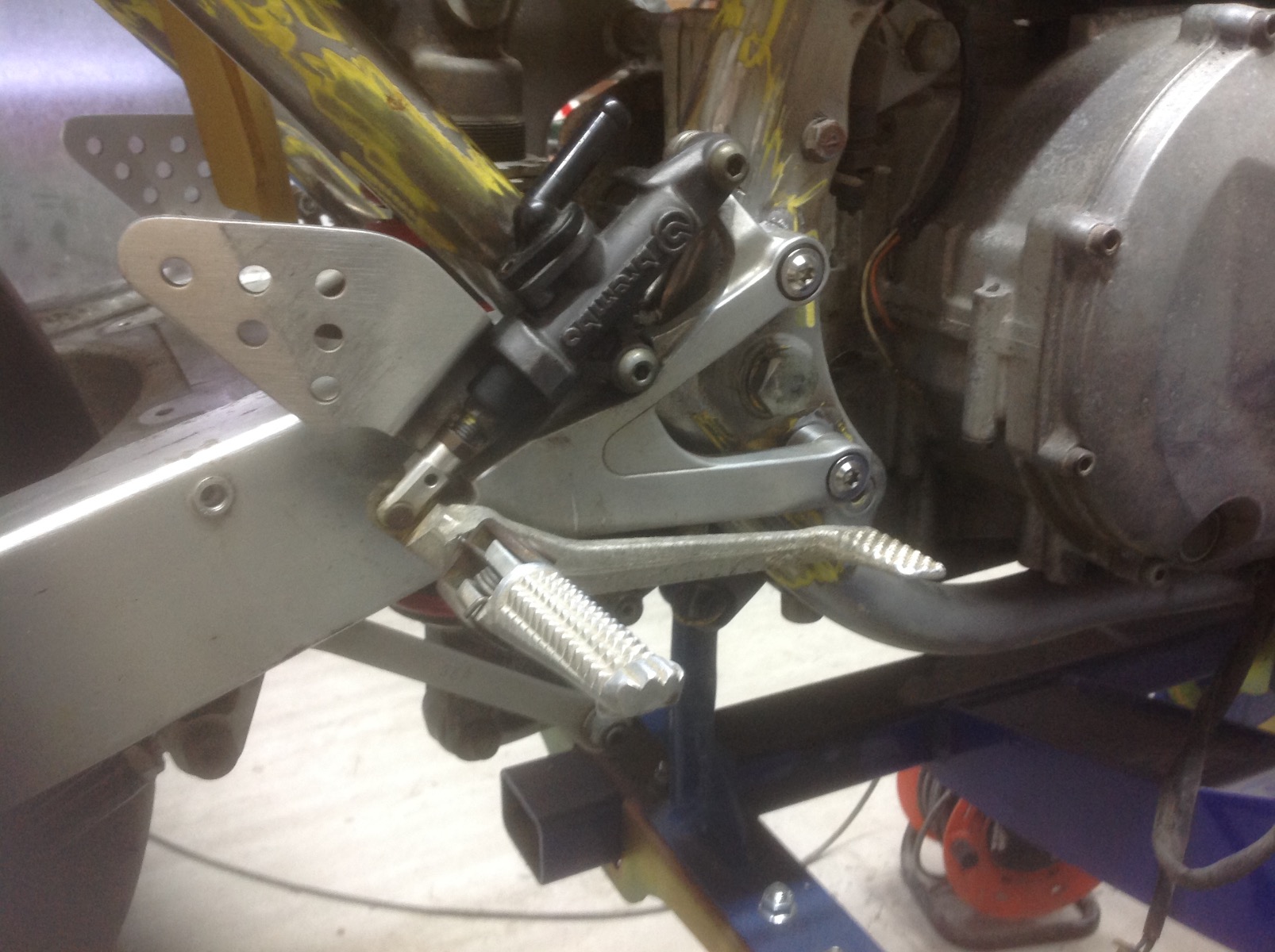 In the spirit of pushing forward I moved onto the foot controls over the weekend. As with everything else so far I wanted to use OEM parts (albeit from something else) in my attempt to try and build something that looks like "it could of always been that way". I picked up a set a while back from a Yamaha R6, I liked the look, the flat orientation of the master cylinder (which as a bonus is Brembo) and of course being a cheap Wookie I liked the price. I wanted them to fit nice and tight into the frame so she stays narrow around the waist (I've only got little legs)