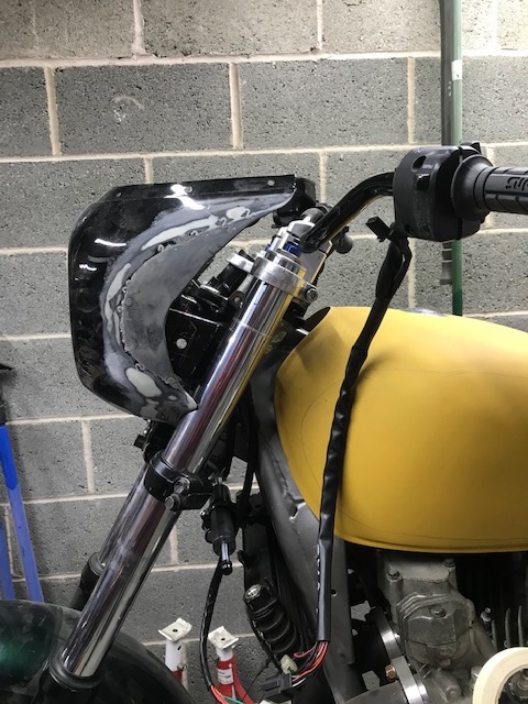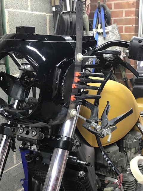 More work done on the nose cone today (there is light at the end of the "fab" tunnel finally) I have built an inner structure at the bottom which has added rigidity and given me somewhere for "captive" fixings which are discreet. I have also added some material to the side opening (only done one side so far) so that I could reshape the opening to replicate the line of the front edge of the fuel tank. It's very raw at the moment but hopefully these kind of details will help achieve the "could have always been that way" look that I am trying to achieve. These side pieces are a PITA as they curve in multiple directions, I found the best way was to get it somewhere near, bond it in then reheat it and clamp it to a steel rule which then achieved the required curvature along the edge. Will just need a light skim to level it off and should be good to go
