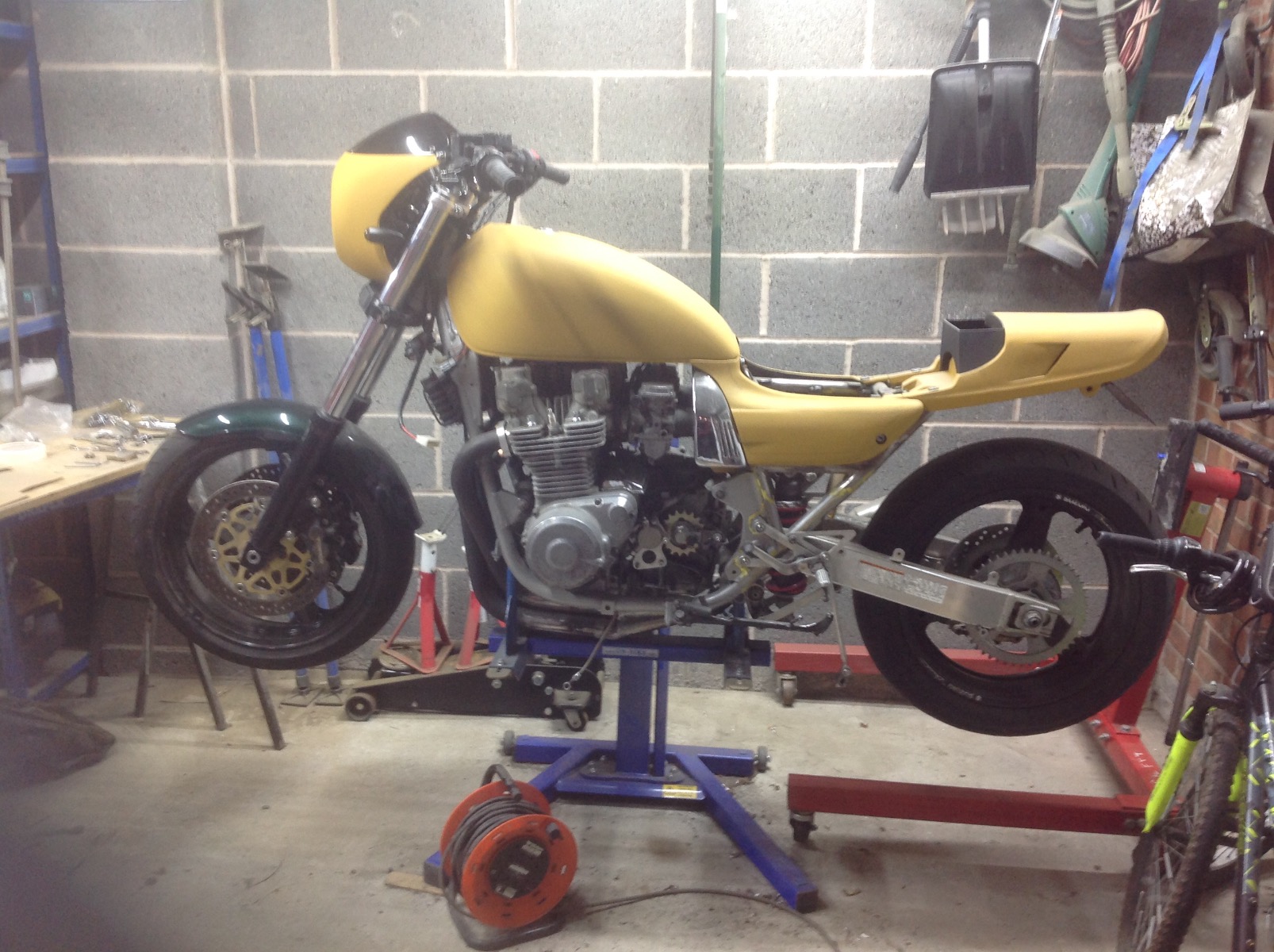 1978 KZ650 C2, 130K kms, Delkevic ex, EI, CVK32, PMC easy clutch, ATK fork brace, steering damper, braced swingarm, ZRX shocks, 18" Z1R front wheel.