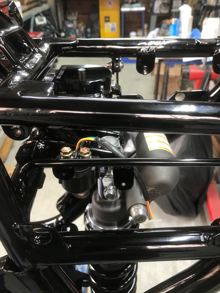 This project has really "turned a corner" this weekend and is finally looking less like a pile of parts. Rear shock is cleaned & reassembled with a freshly coated spring and lower cap and sitting in it's final resting place. Oil catch can and starter solenoid are on, as is the front end. Really glad now I spent the time on the frame, it's not perfect but it's no "show pony" and I'm more than satisfied.