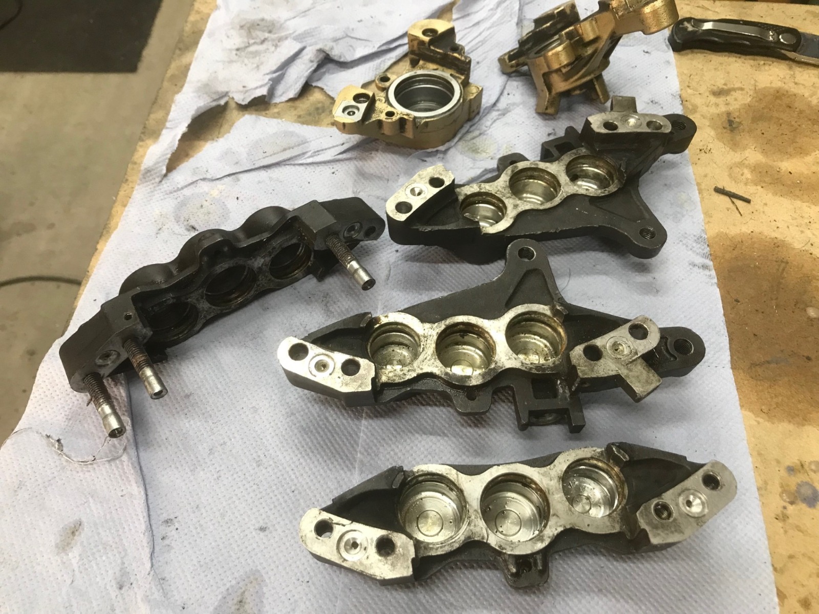 with new tyres fitted on Saturday morning then I started on the brakes in the afternoon. The front 6 pots where an "absolute whore" to get apart thanks to somebody using chocolate hex through bolts and no "anti-seize", in the end I had to drill the heads off three of them !!! Following a good soaking in oven cleaner I have decided to "counter-bore the through bolts (purely asthetic) so they are off to the blaster on Tuesday then I intend to try and "anodise them". I am also getting the rear master ready for blasting and have "turned" some plastic plugs to keep the media out of the internals (the blaster has plugs for the calliper pistons. Finally I have managed to get my adjustable dog-bones done today