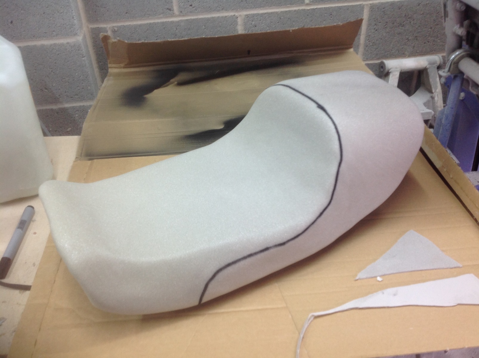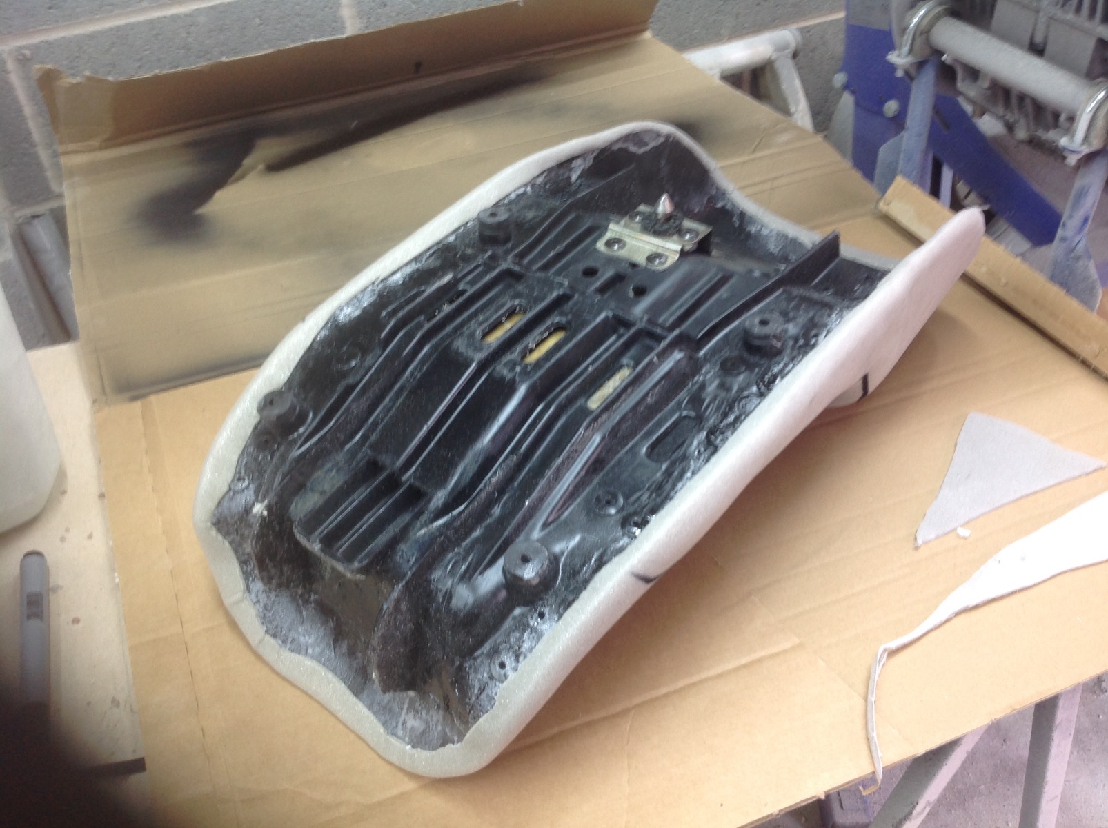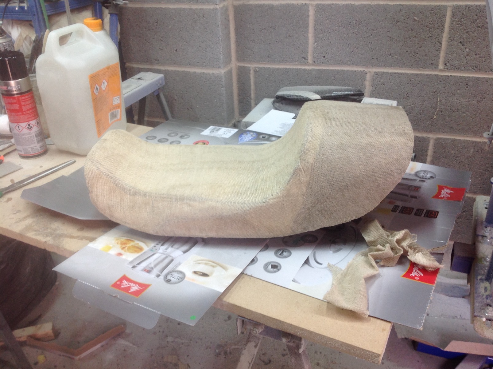and I thought I would share some "old skool" trimming techniques for anyone that is interested. You can see from the earlier pics that I had cut and joined the original Triumph foam in a few places, to bind it all together and ensure the joins don't open up at some point in the future I have applied a layer of "scrim linen" wich is like a soft "Hessian" material. This binds the foam and the joint between the foam and the pan. I then added a layer of "scrim foam" which is thin foam on a fabric backing (this is the stuff sewn to the back of covers to create quilting etc) this is like the "high build primer" before your paint job. Hopefully doing all the prep should mean the trimmer doesn't charge the earth as the "donkey work" is already done.