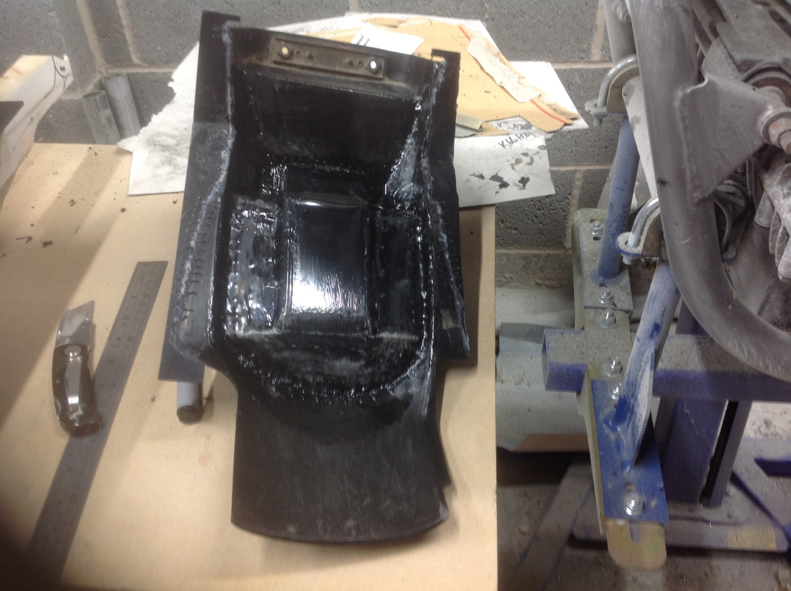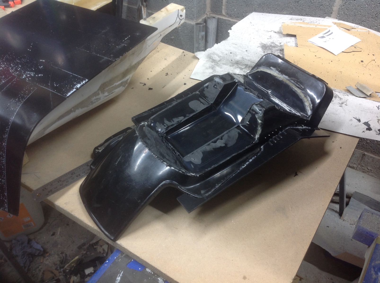 More thrashing on plastics this weekend, have got the mods done on the rear inner fender (to clearance other components) just needs tidying up and trimming now once the bonding etc has had time to set properly. I have included a pic of an original for those not familiar with how it used to look. Also started bending a sheet of ABS to make the finishing panel that will replace the original fender