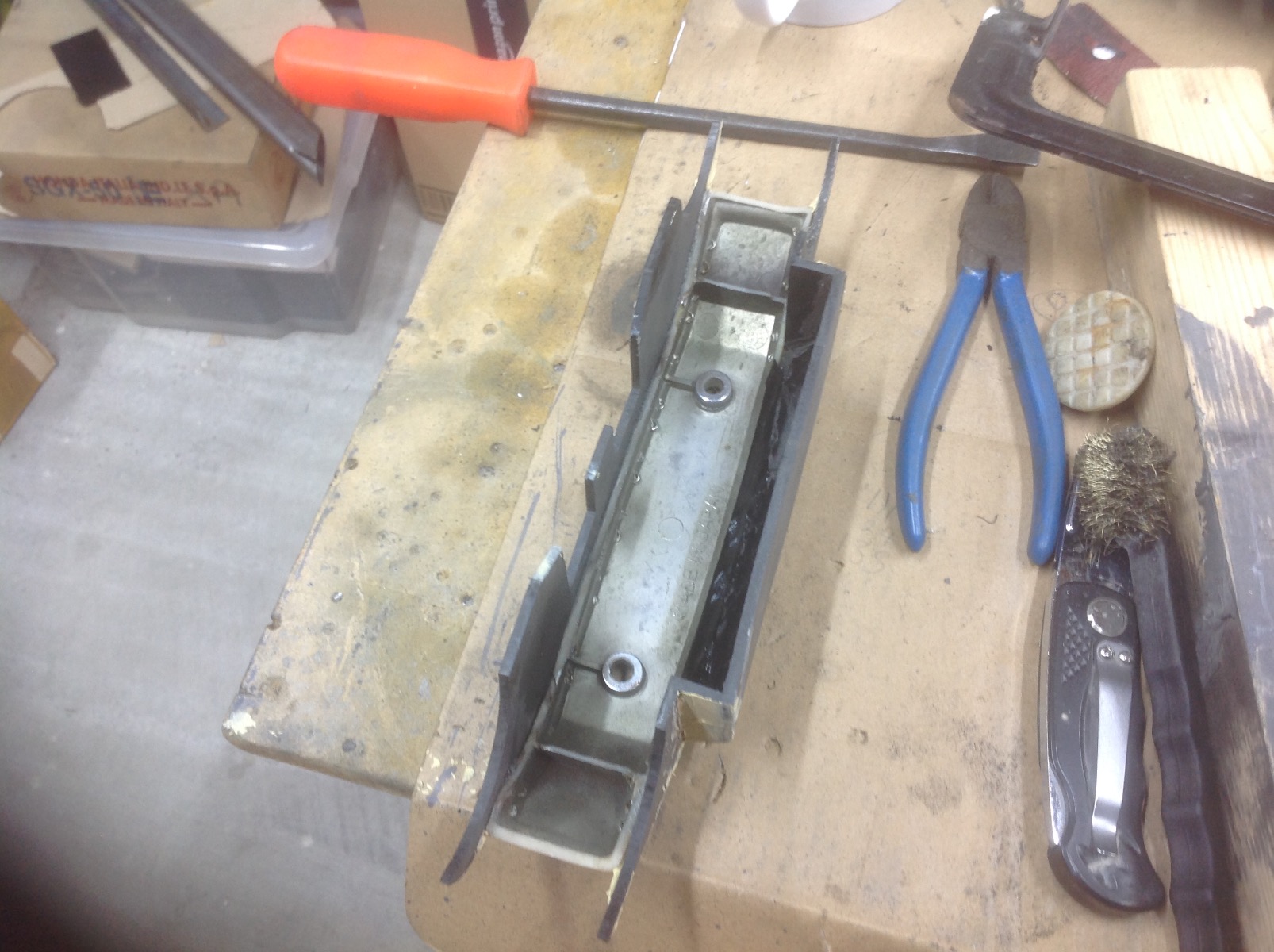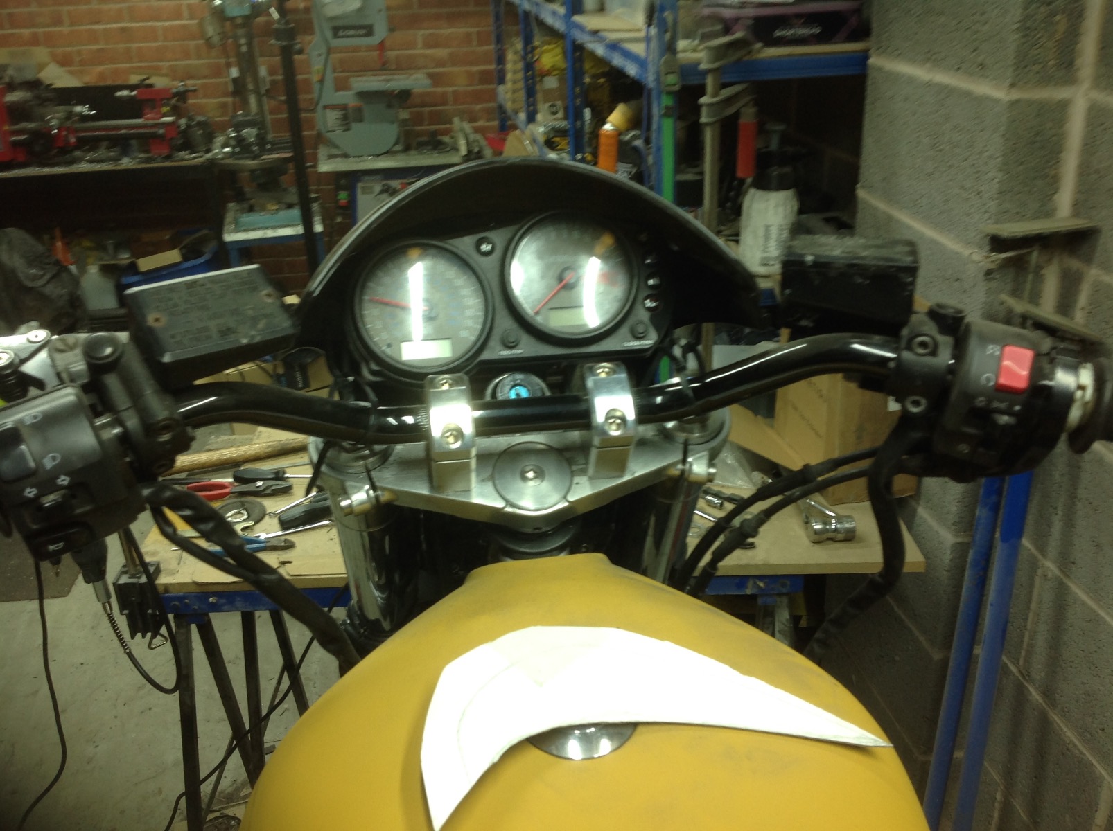 Still pushing forward, slowly but still progress. I've mounted a second brake splitter for the clutch & made the mounting bracket for the instruments. I wanted to re-use the insignia, cover on the bottom tree but of course it didn't fit the new front end, so back out with the glue and "hot stapler"