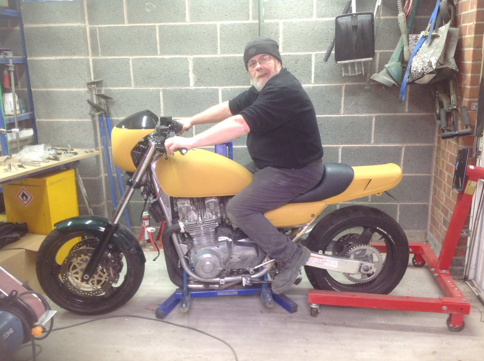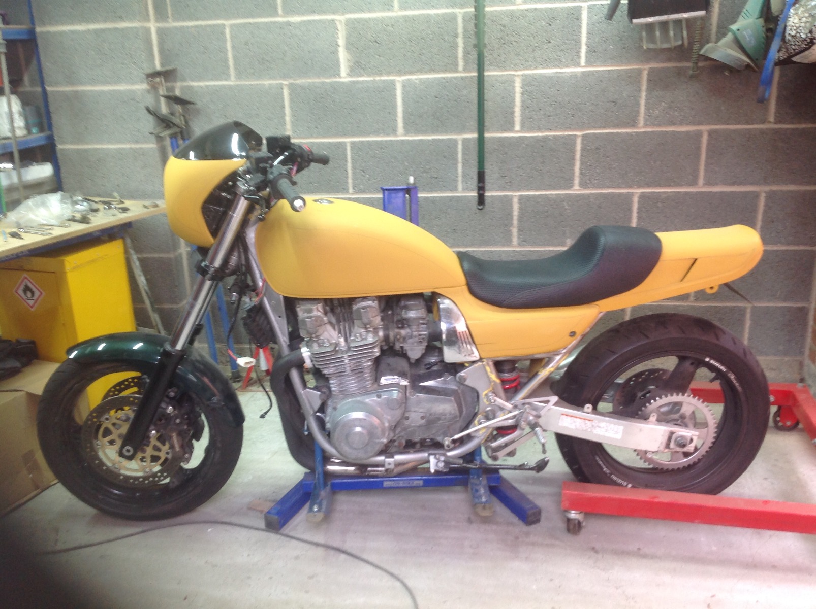 10 Mar 2024 01:48yes Rolf the yellow paint is filler/primer. The cowling issues are resolvedLooks great Wookie much work payd off !.I like the seat toI have not read the tread thrugly ,but are the wheels from yama xjr 1300 or are they zxr ?. I assume that color is just primer ? One option that may clear the cowling is using TT clip-ons or plase the steeringbars upsidedown ,but that will not make the ride position so comfortable.