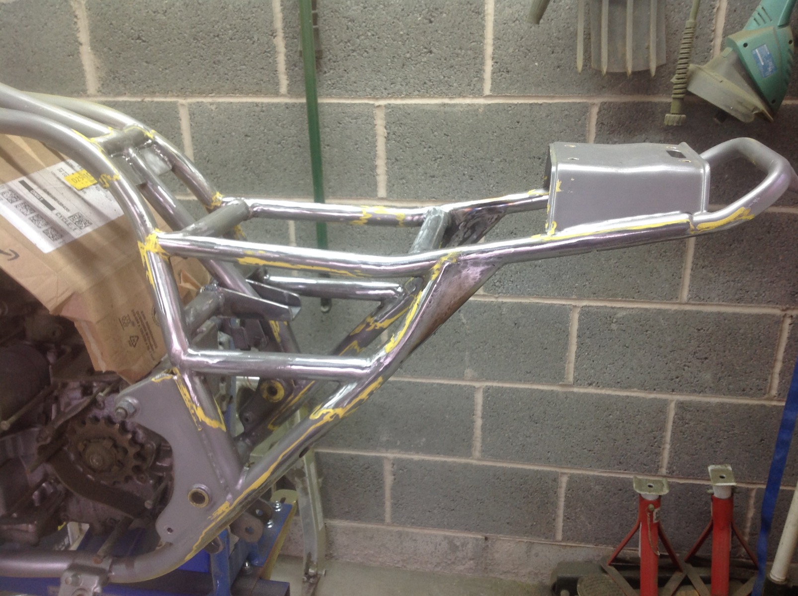 Managed to pretty much wrap up the frame mods today, cross tubes are in for the seat mounts, side braces (which will also give me somewhere to hang stuff) and rear gusset's which have replaced the shock mounts. Hopefully tomorrow can get the mounts done for the tank, electrics box and beather catch tank