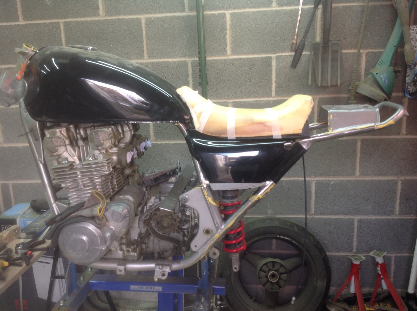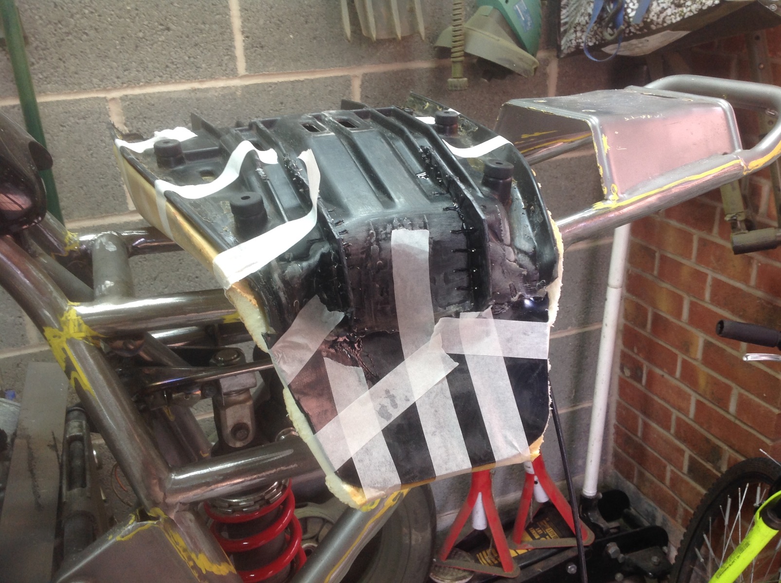 still now that I have the rear tank mount sorted (I have pulled it down 90 degrees) to level it and give me some options with the seat (I only have little legs) and also notched the rear cross tube to take the seat catch. Hopefully tomorrow I can venture into the world of thermos forming plastic to adapt the seat pan I have (this is a new experience for me)