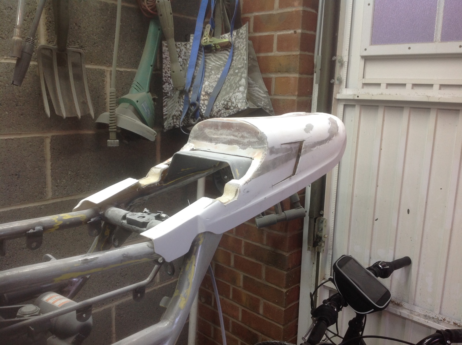 Another weekend spent on the fibreglass, I wanted the duck bill to look like it belongs on this later bike. My opinion is that a lot of great bikes look a little "out of sorts" when using body parts from other bikes as the designer made the components on the donor to work together. To this end I decided to use the bottom of the tank as my datum line and shape everything else around that, the top of the side panels will be on a parallel line with the tank and also I wanted the top of the duck bill to also be parallel with the tank bottom. This ended up being a complete PITA as after cutting it along it's length and lifting the front edge 25mm due to the taper on the sides. Still got there in the end, I even decided it hadn't been a big enough PITA so I decided to add a couple of vents to allow some airflow around the lithium battery that will be in the tail and to invert the front mounts to clear the seat pan. There is still plenty of work to do for my friends "Bond-O" and "San-Ding" before it is finished