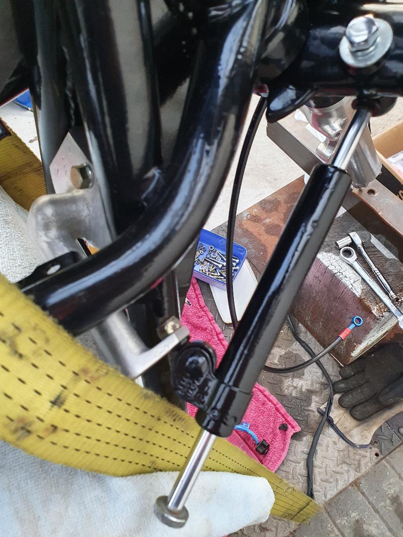 Before the wiring loom starts going up into the frame I thought I better get the steering damper bracket into place, I painted the steering damper (it was red) and did a test fit.