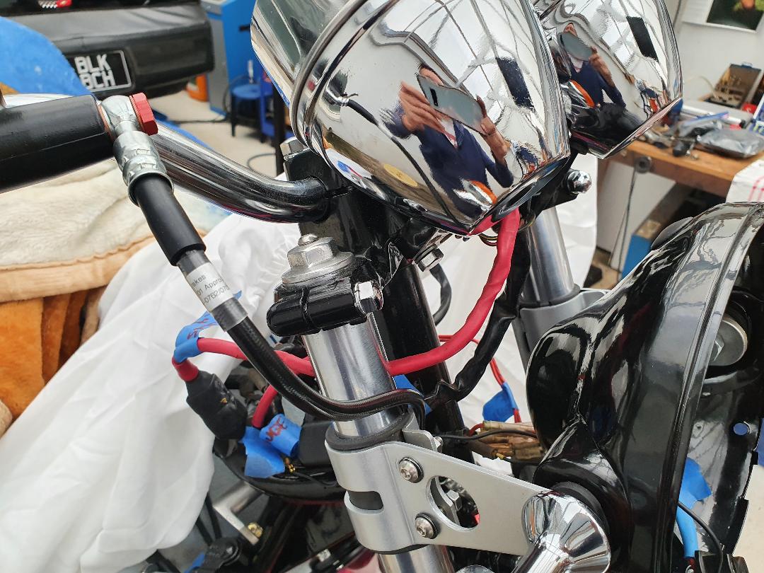 Gave it a test fit up (the line will go through the round hole in the headlight bracket when the headlight gets bolted up a bit higher)