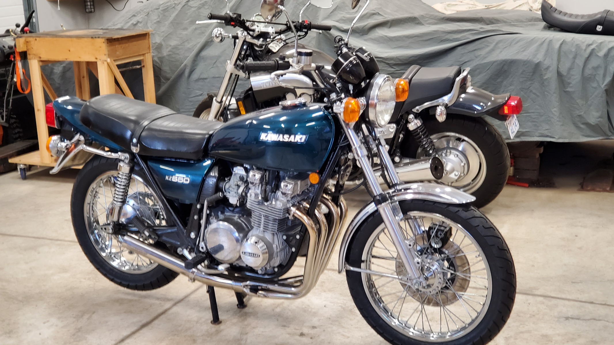 1978 KZ650 C2, 130K kms, Delkevic ex, EI, CVK32, PMC easy clutch, ATK fork brace, steering damper, braced swingarm, ZRX shocks, 18" Z1R front wheel.