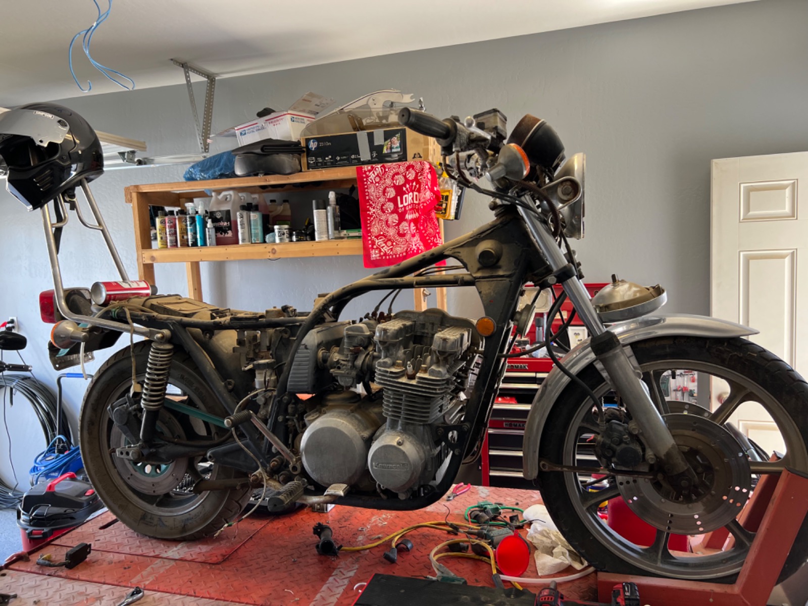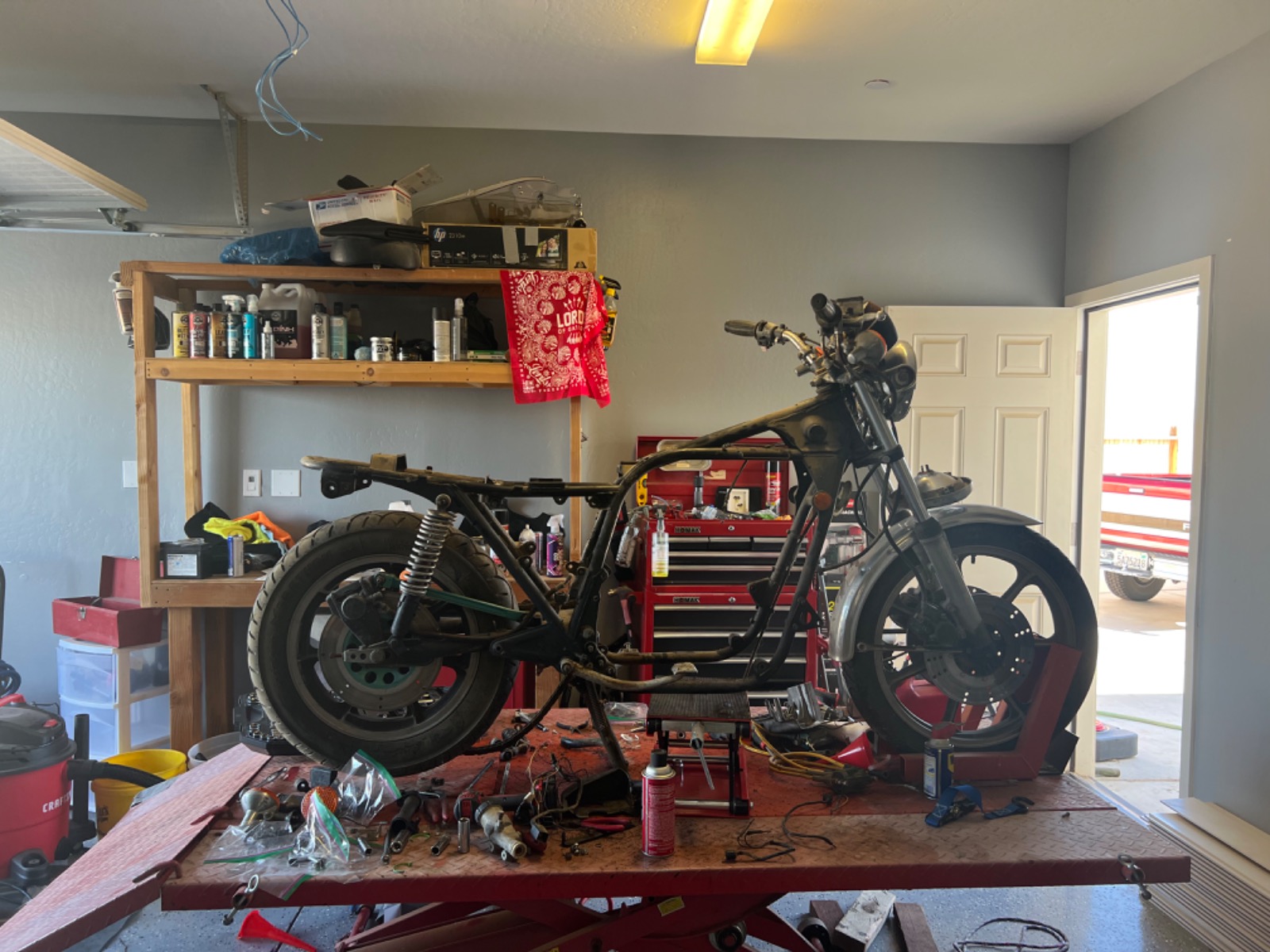 Triple tree front end, new swing arm, better shocks, wheels/tires, clean up the frame and get rid of a lot of attachment points so I can make everything hidden under the seat. Powder coat the frame. Engine rebuild. (How in depth will depend on the tear down). MotoGadget buttons to clean everything up along with the unit blue (really excited to play with that)