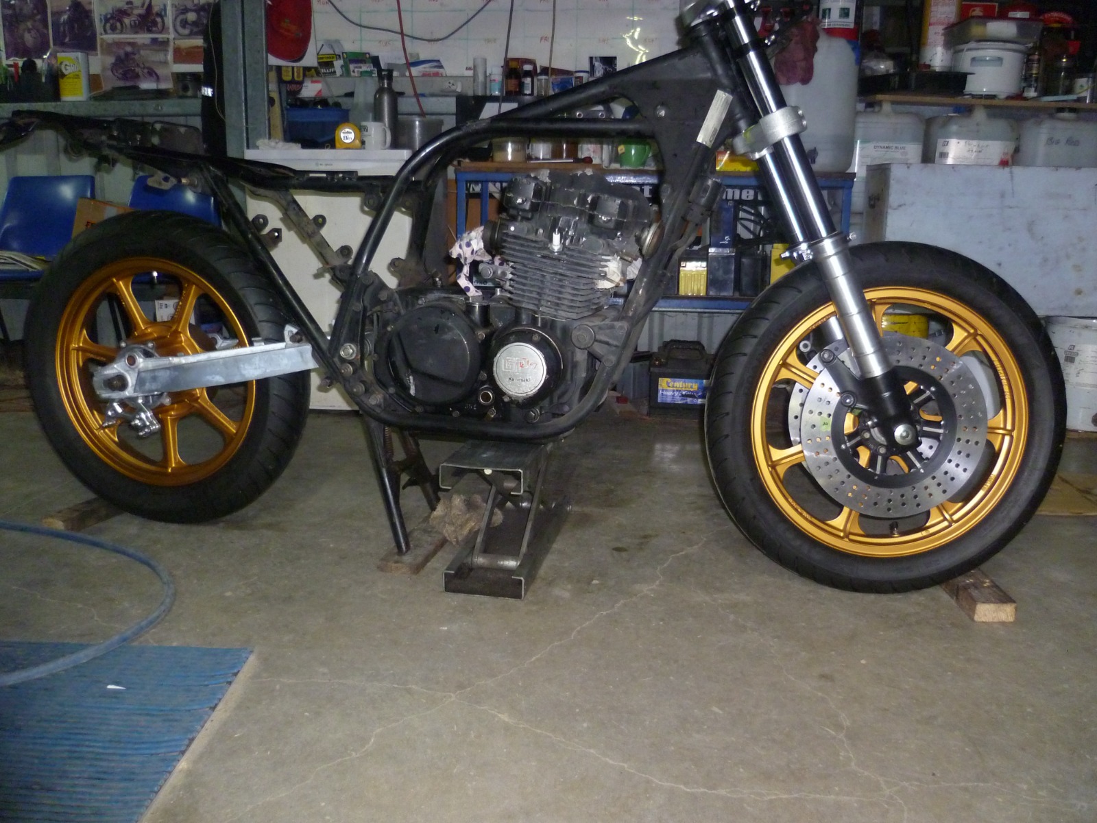 12 Jul 2022 18:29 - 12 Jul 2022 18:32I was born in the early 60's so I grew up with these bikes, had a pile of Honda 750/4's, old Suzuki's, Kawasaki's and a few in between...!I think the ZX6 only has about 25mm offset in their triple clamps, that'll take the nimble little 650 out to barge like Harley steering, kind of counterproductive on a little 650. I've had Devon at Cognito Moto {through a friend of mine stateside} , make me custom offset triple clamps to keep the steering correct on another long gone project. If you're using the 17 inch wheel that also changes things slightly, but will change things massively at the rear, it will put the chain line out miles, the 17 inch wheels are generally far too wide at 5 inches plus, a fairly easy swingarm conversion is using the Katana alloy swingarm, 2 small 2.2 to 2.3mm spacers either side, I used precision shims, and it bolts right up, it's a little bit longer than the stock are but not long enough to screw up handling.... Also fork length needs to be considered, most Jap front end swaps, the forks are not long enough. I've just done a couple of bearing swaps and made up new spacers to fit Kawasaki Z1300 wheels to a Triumph speed triple 45mm Showa front end , which is going on the front of a 1982 GPZ frame, I had to get custom made fork tubes 100mm longer to make the front ride height work. Nothing is as simple as it seems...My current project. 1st pic, the original bike, 2nd pic with swingarm and front end installed, 3rd and 4th pics are how it will look finished bar a pain job and the seat being redone..Yeah I’ve been around these styles of bikes for a while. Brother in law had been through quite a few bikes over the years and we both wrench a little bit. Personally have had 2 Harley’s and a bonneville. Still have my dyna.I’ll be doing a stem from cognito moto with a zx6 front end. Swing arm is to be determined. I am in no rush for this build. It will all be dealt with properly, mocked up and all that. I’d like to say I’m pretty OCD so skipping proper steps will not happen.