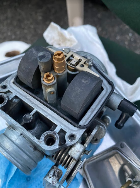 I just took apart the carburetor, and it looks very clean on the inside. One of the jets had a plug on top, so I removed the plug (plug still on in pictures) in hopes to get the bike running a bit more rich. I think it’s lean because the original airbox has been replaced with some aftermarket parts. I also tinkered with the idle screw a bit before taking the carb off, which seemed to help a little bit