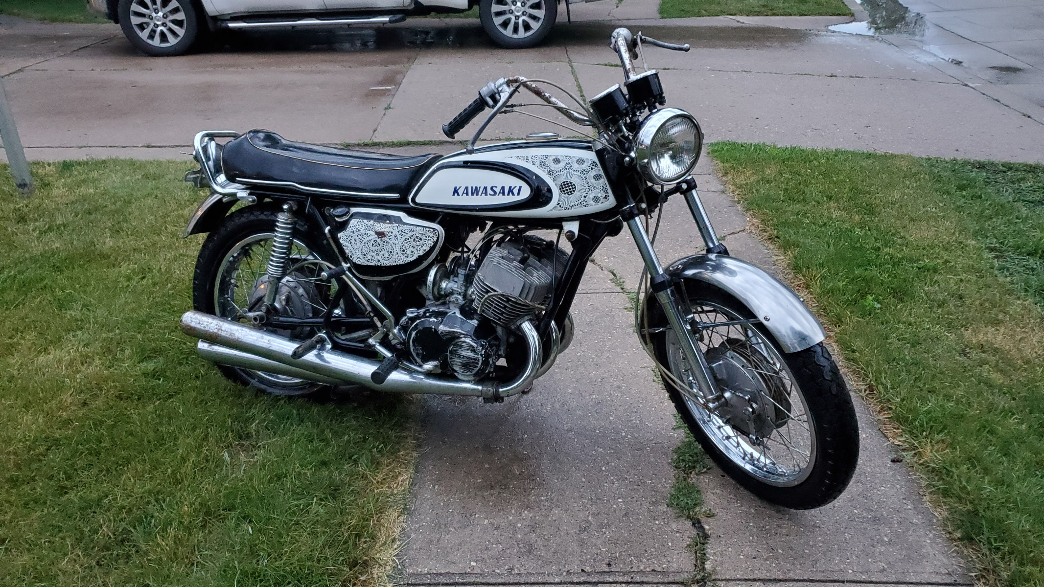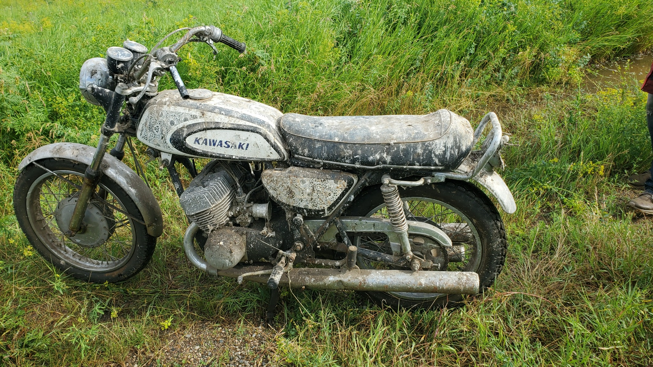Great Find!!!!! Its getting real hard to find early H1's in any condition anymore. I see it has the original front tire. The front tires on those bikes lasted almost forever because most of the time the front end was up in the air!!!! Wonder if it still has the bridged intake port cylinders on the motor. I believe those only came on the '69 model year motors.