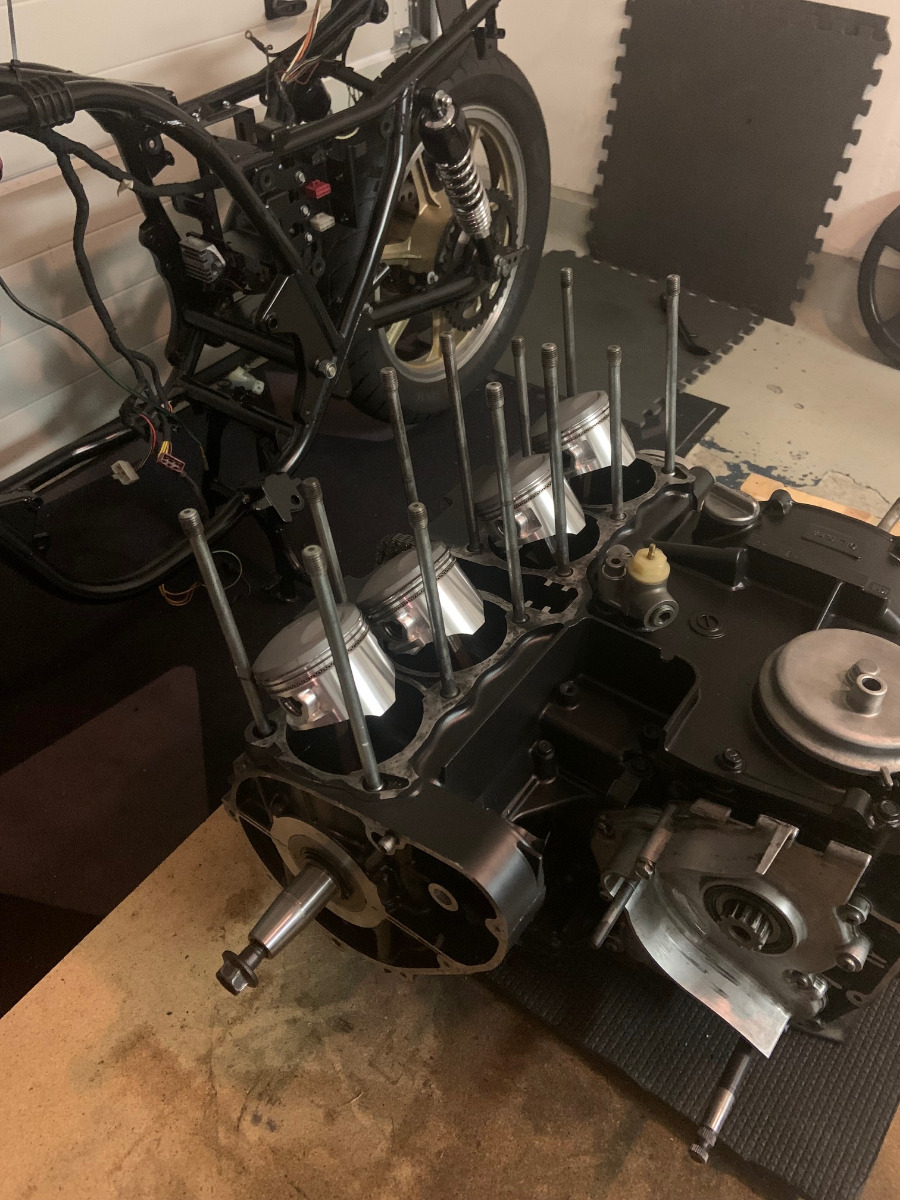 Today I installed the engine into the frame. My brother in law helped me and we used a floor jack supporting it once in frame. Went very well, no scratches. I dont know what is best practice, assembling the engine before or after the installation, but I hope the cylinder will be OK putting on afterwards. I saw some piston holders in the clymer manual that you place under the pistons before you lower the cylinder down on them. Looked easy enough?