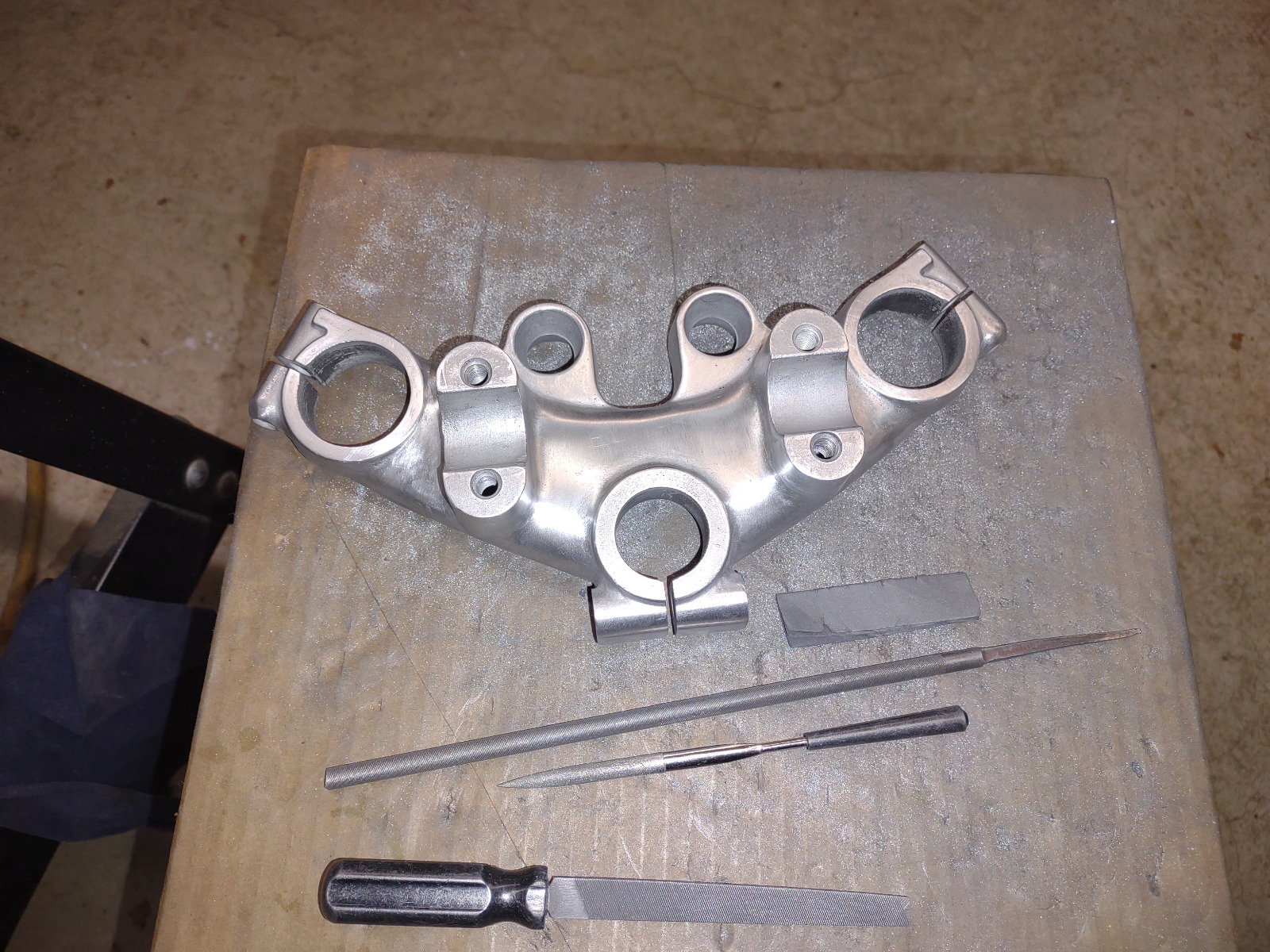 After the brake fluid bath I use a 6" coarse flat file and a fine round file to remove any casting and grinding flaws. Then if I need to because of corrosion pits I start dry sanding with 220g. Then I use 320g and finish with 400g.