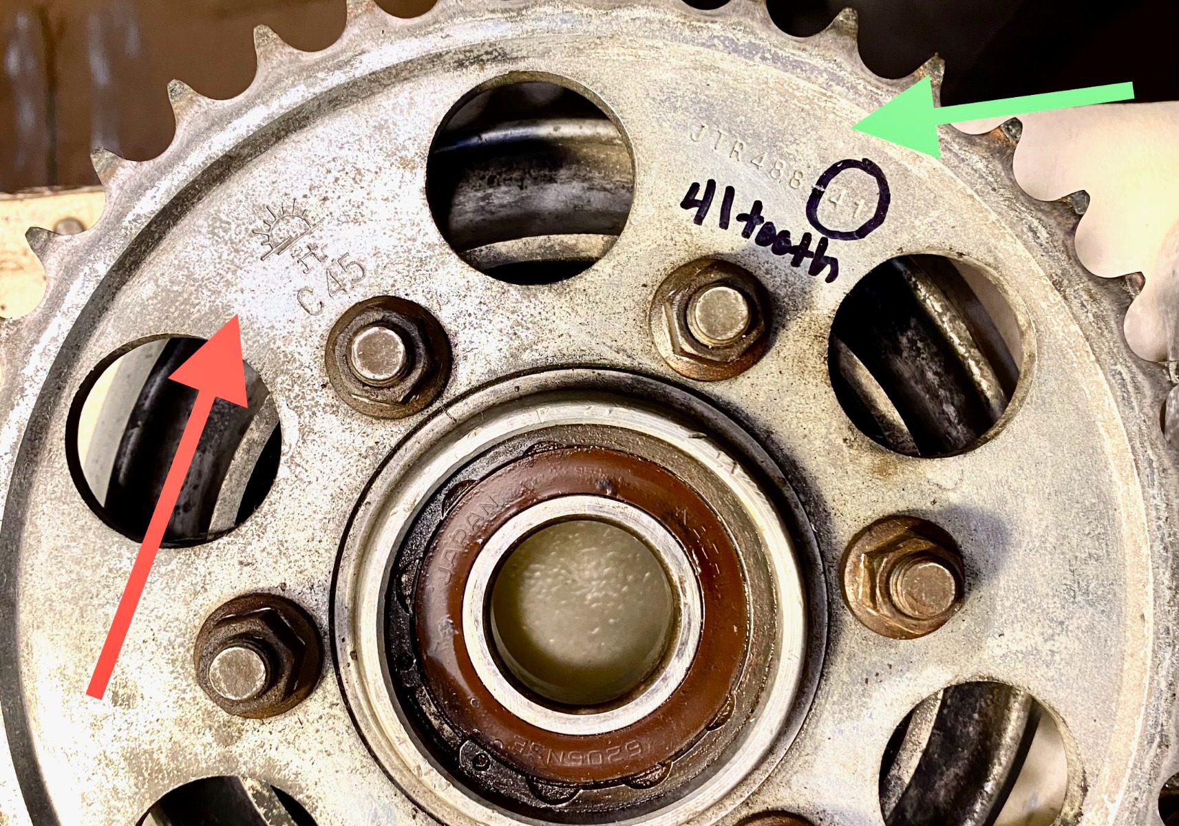 Here's the rear sprocket, which looks like an aftermarket JT one with a count of 41 teeth. Do you think this will be good gearing? I live in flatlands with lots of "nice" straightaways!!