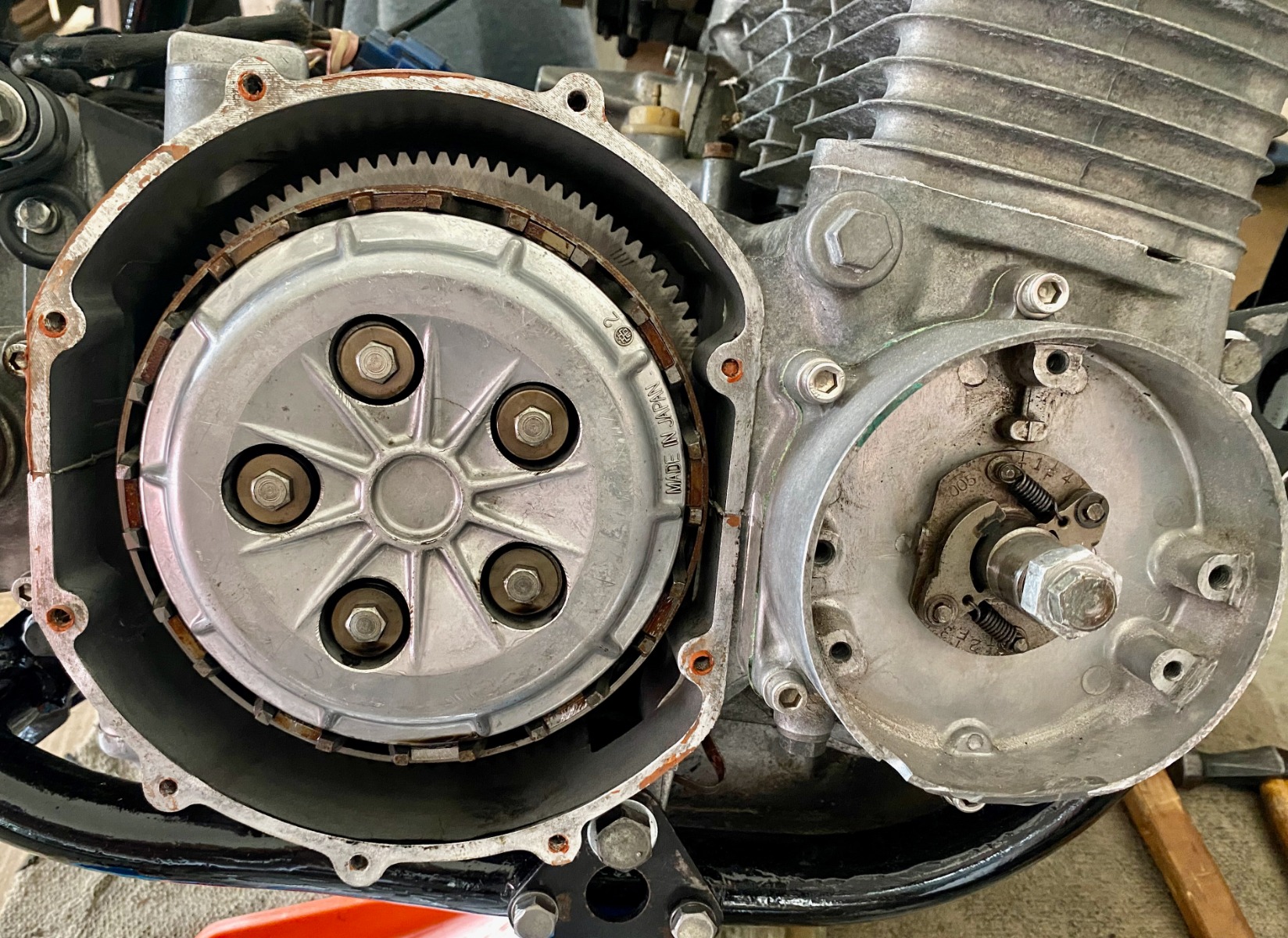 Once in the frame I'll lean the engine hard left to minimize oil spillage and renew the clutch cover plate, which I think, like the valve cover, is just orange silicone without a gasket.