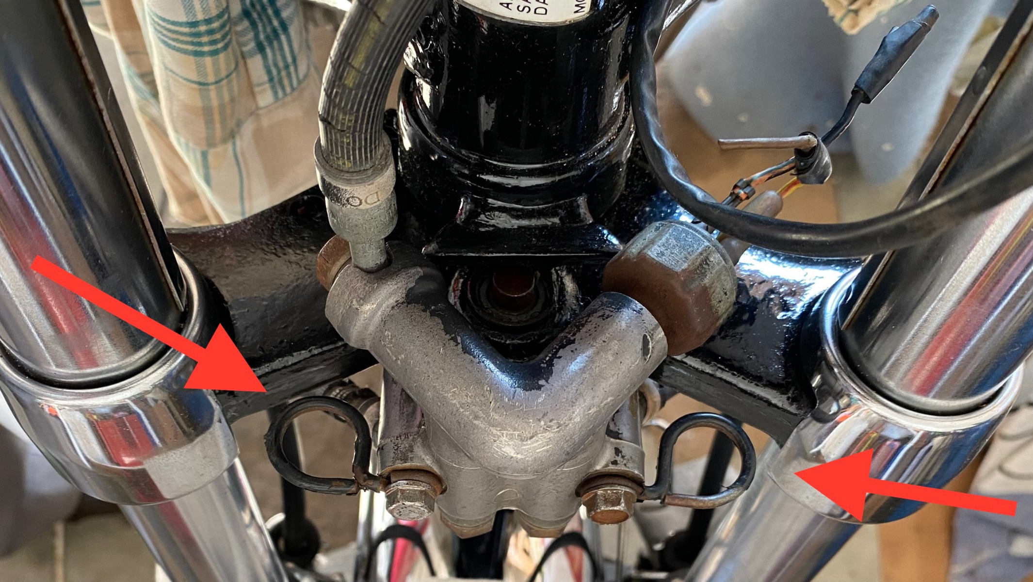 And those loops on the front brake hydraulic junction are cable guides for the tach and speedo cables, which are now installed correctly with the loop facing backwards.
