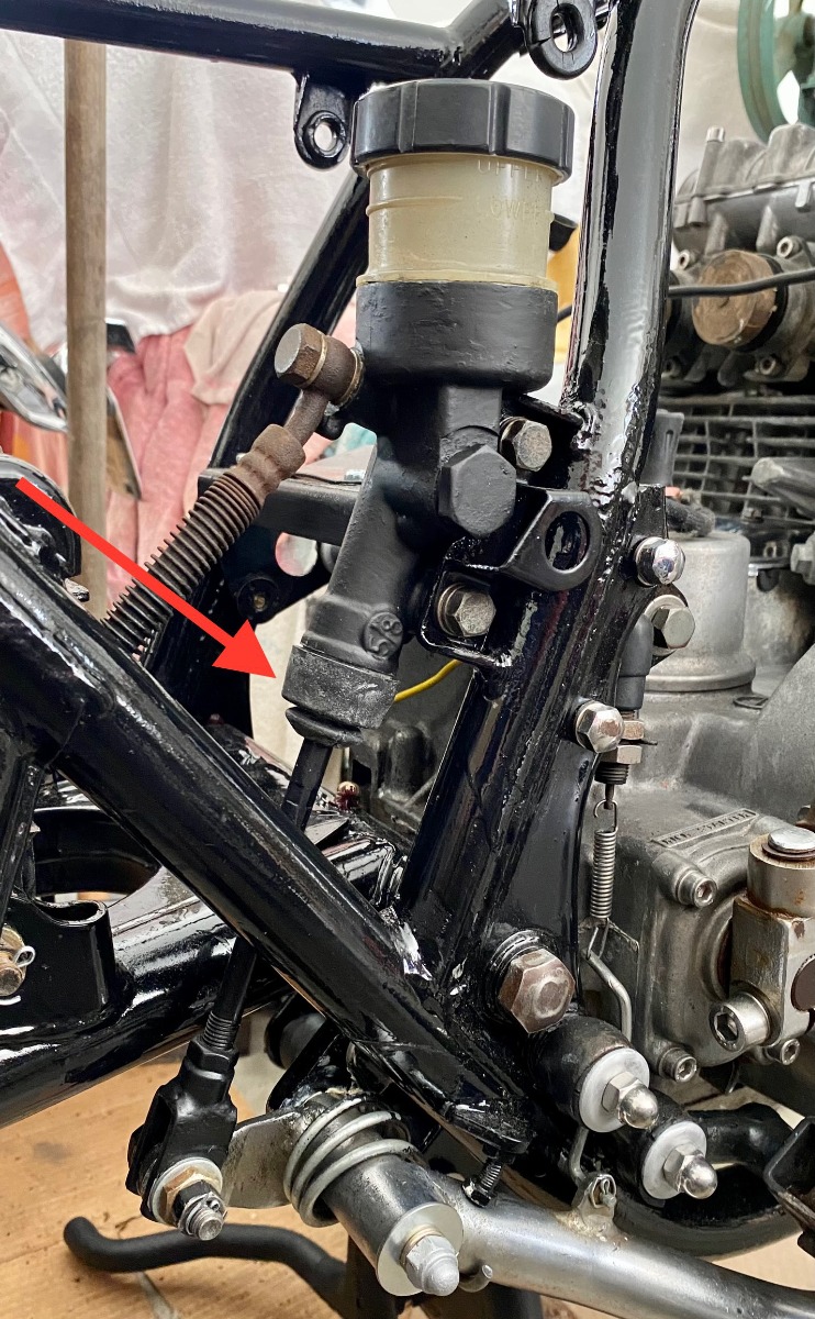 wdhewson, Did you rebuild the brake calipers and master cylinders? if not it would be a wise thing to do. I noticed the rear caliper in need of a paint job and the rear master cylinder seems to have been leaking at one time. If you went to all the trouble to paint the frame you don't want brake fluid leaking on the fresh paint and working trouble free brakes are a nice thing to have.