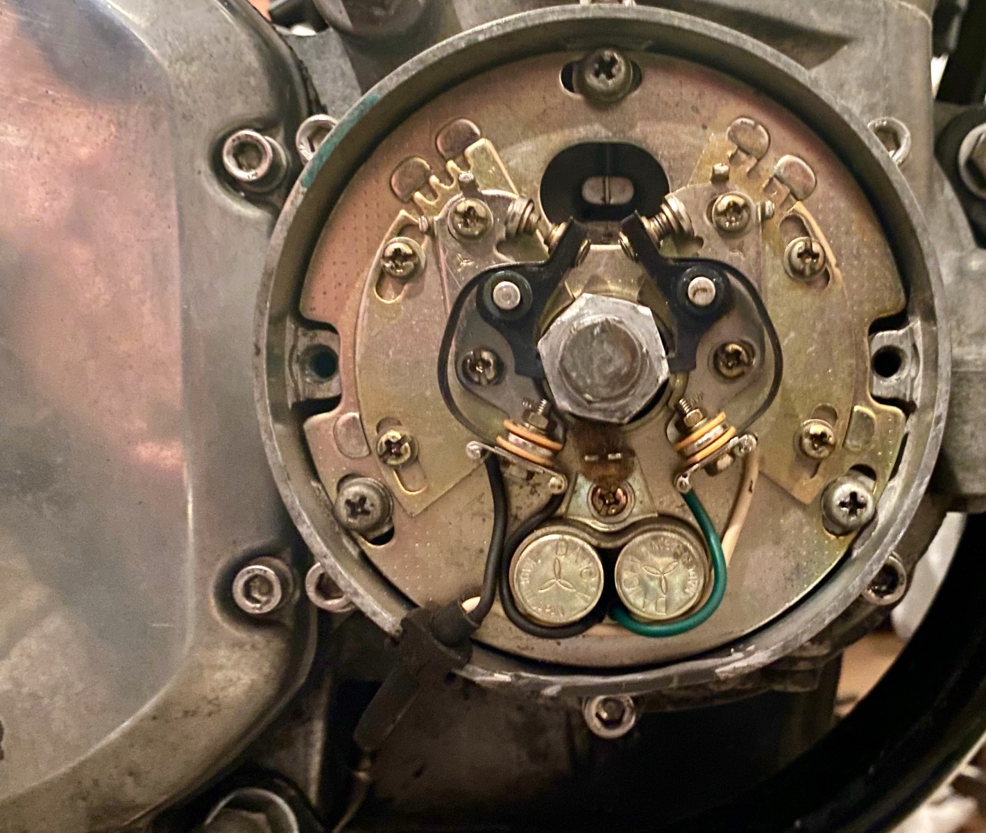 Lined up the F 1,4 to the index mark on the crankcase to set, I believe the left hand set of points, to fire cylinders 1 and 4. I'll use the old fashioned test light method where the light just winks out when the point open. It's fussy work setting points, but a little patience and the subsequent strobe will show it dead nuts on.