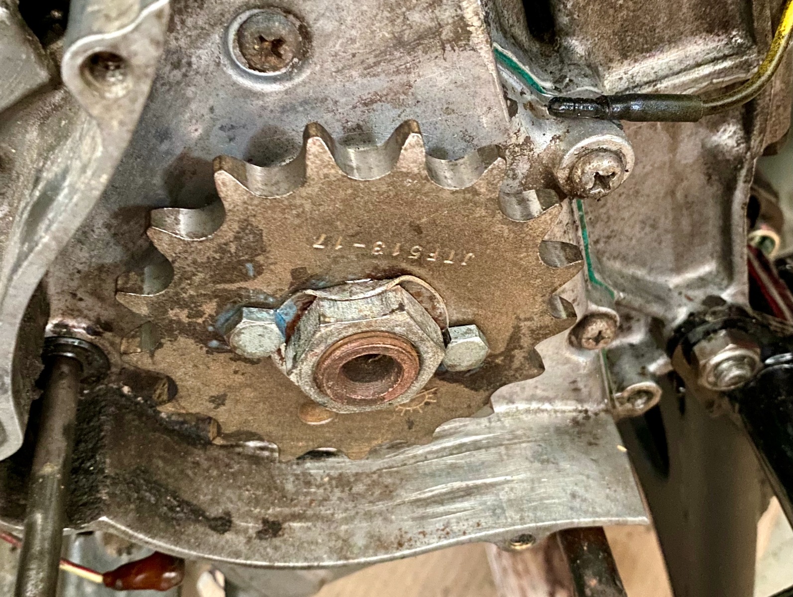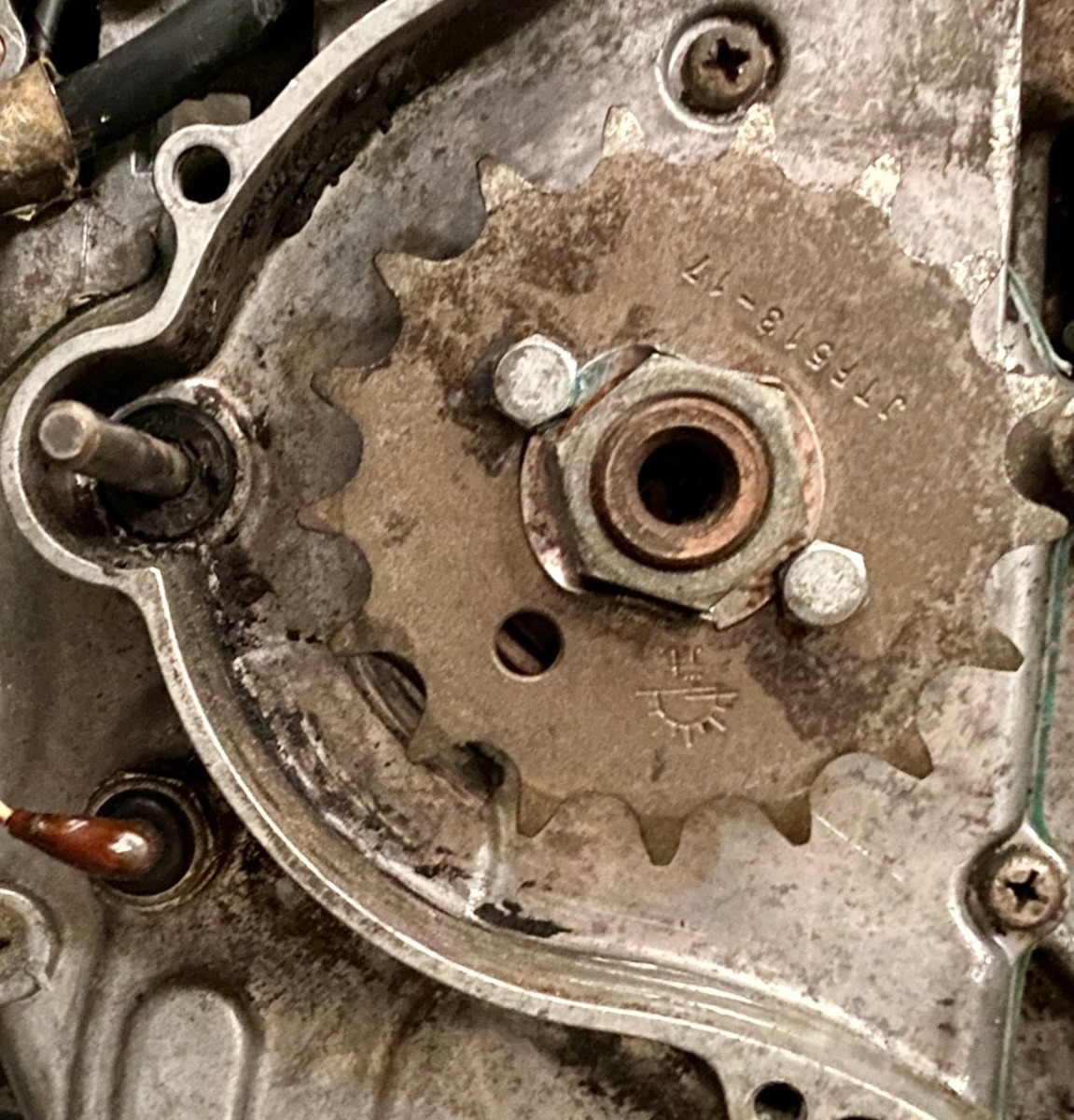 The JT 17T 530 sprocket has two threaded holes, perhaps for a puller, so I put in two short bolts where the bolt heads bear down on the washer under the main nut. I suspect 1 bolt would be enough, but I sought balance, and went with 2 bolts. Both bolts, cleaned and blue loctite applied. Then folded the washer onto the nut hex faces in two opposite locations.