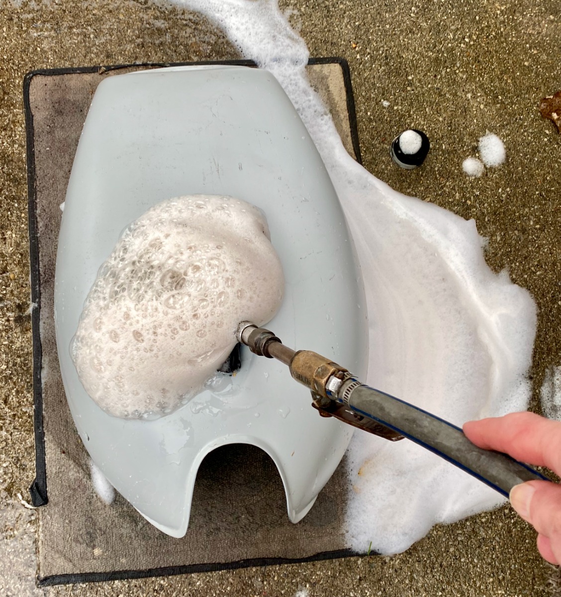 My friend was doing just this with his mint original paint Honda CBX tank, 6-cyl. Slippery soapy hands, and he threw it on the driveway. $1200 to repaint. So I go to the backyard and stand in plush soft grass.