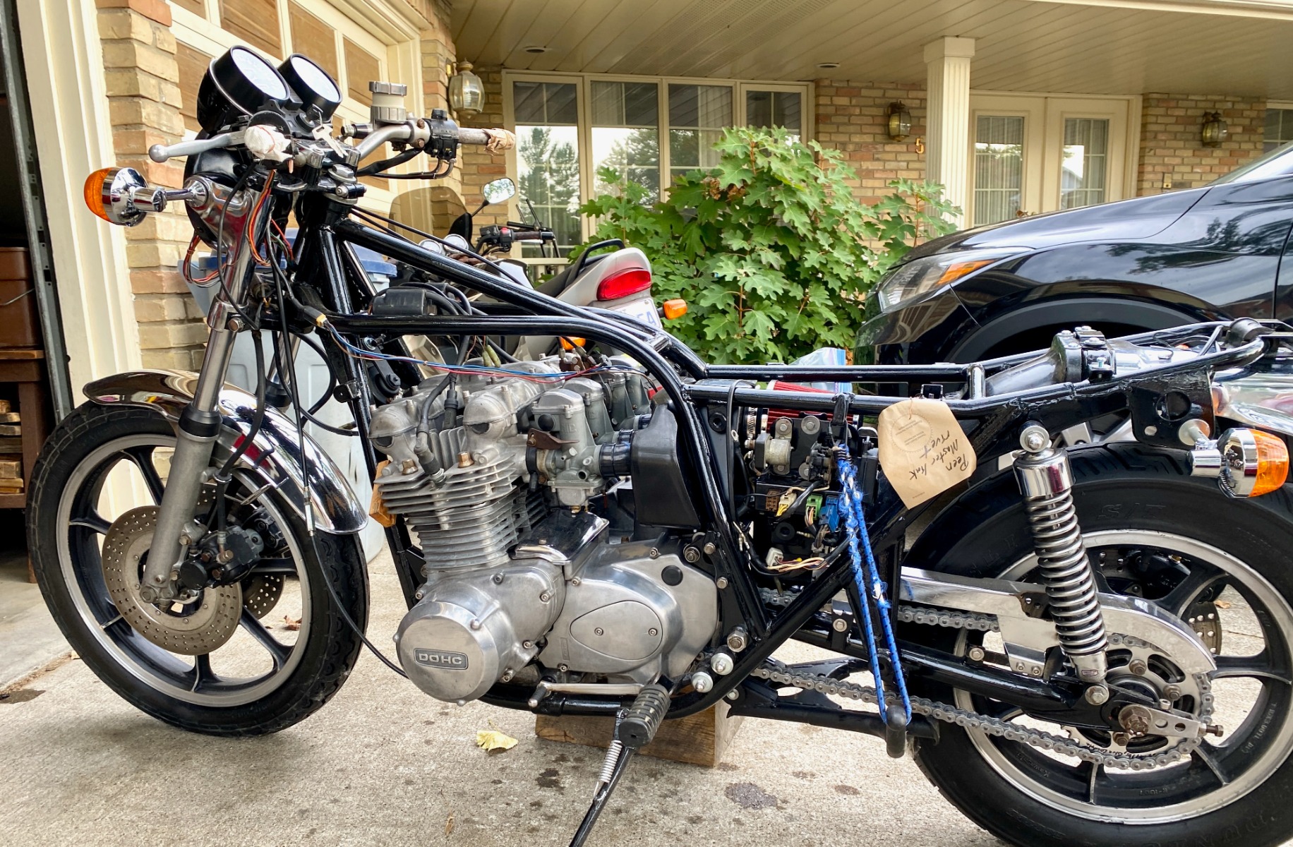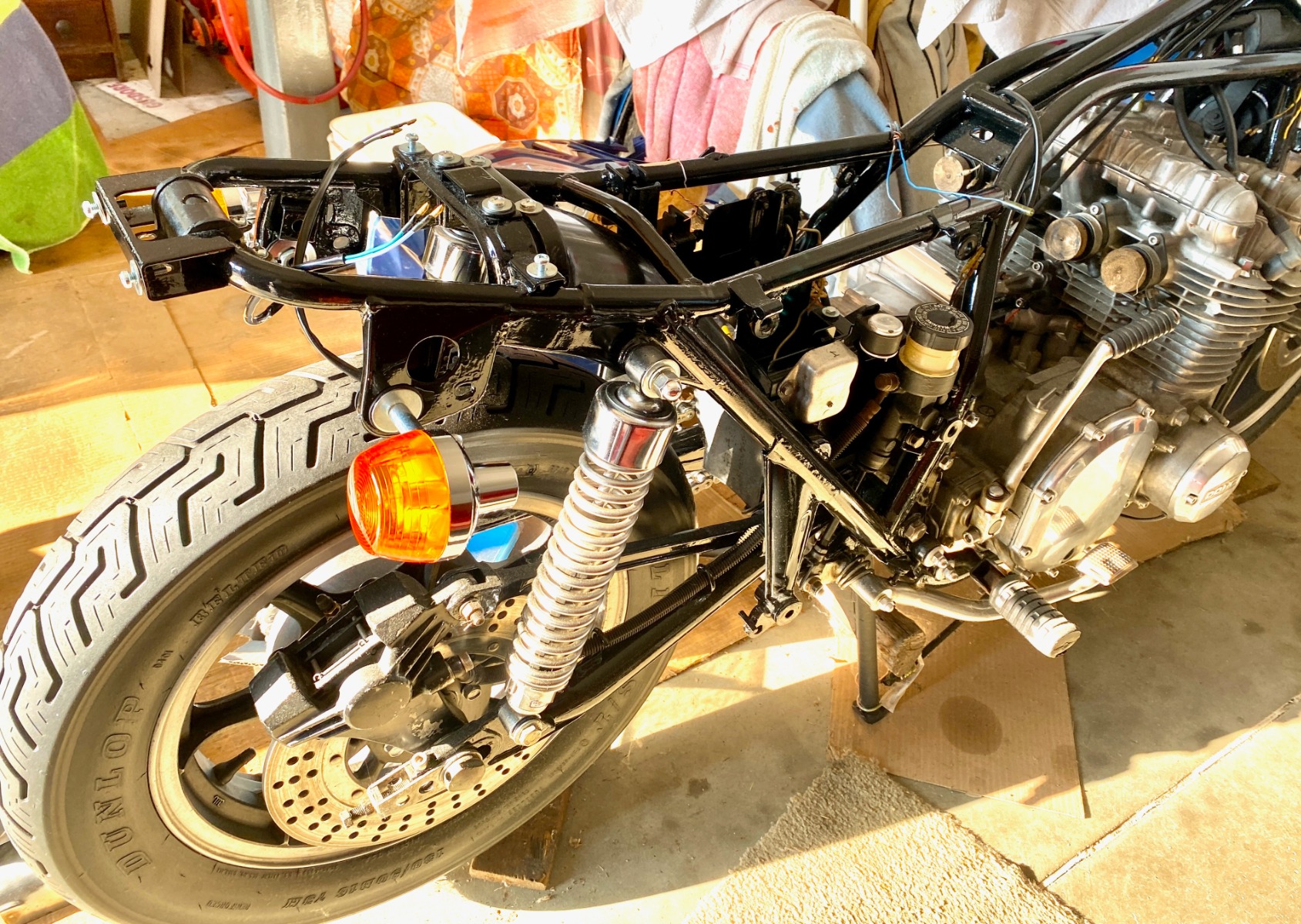 1978 KZ650 C2, 130K kms, Delkevic ex, EI, CVK32, PMC easy clutch, ATK fork brace, steering damper, braced swingarm, ZRX shocks, 18" Z1R front wheel.