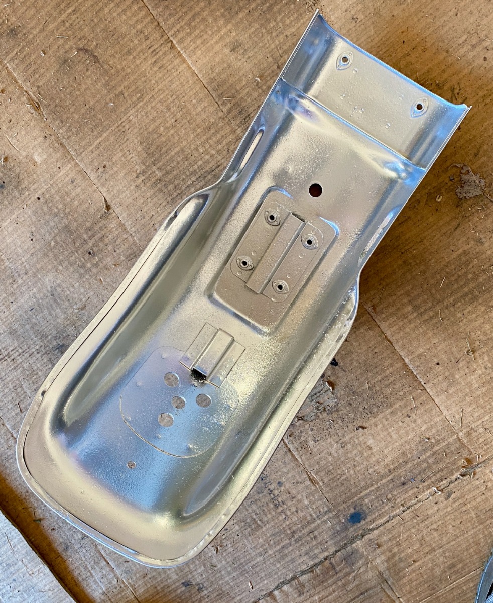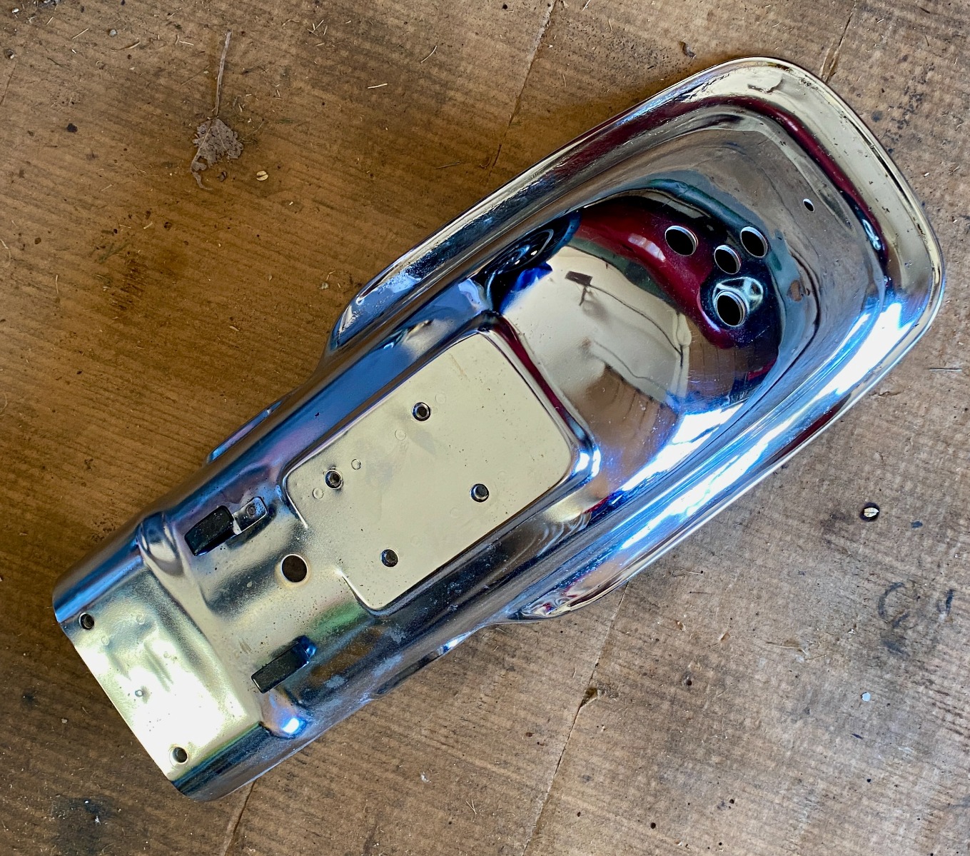 I was fortunate to have an ad pop up for some KZ900 parts not too far from me, so I picked up a 1974 KZ900 rear fender which is reported to fit my 1977 KZ1000. And indeed it does fit. There's a bit of chromium plating rusted through, but it looks fine at 5 or more feet.