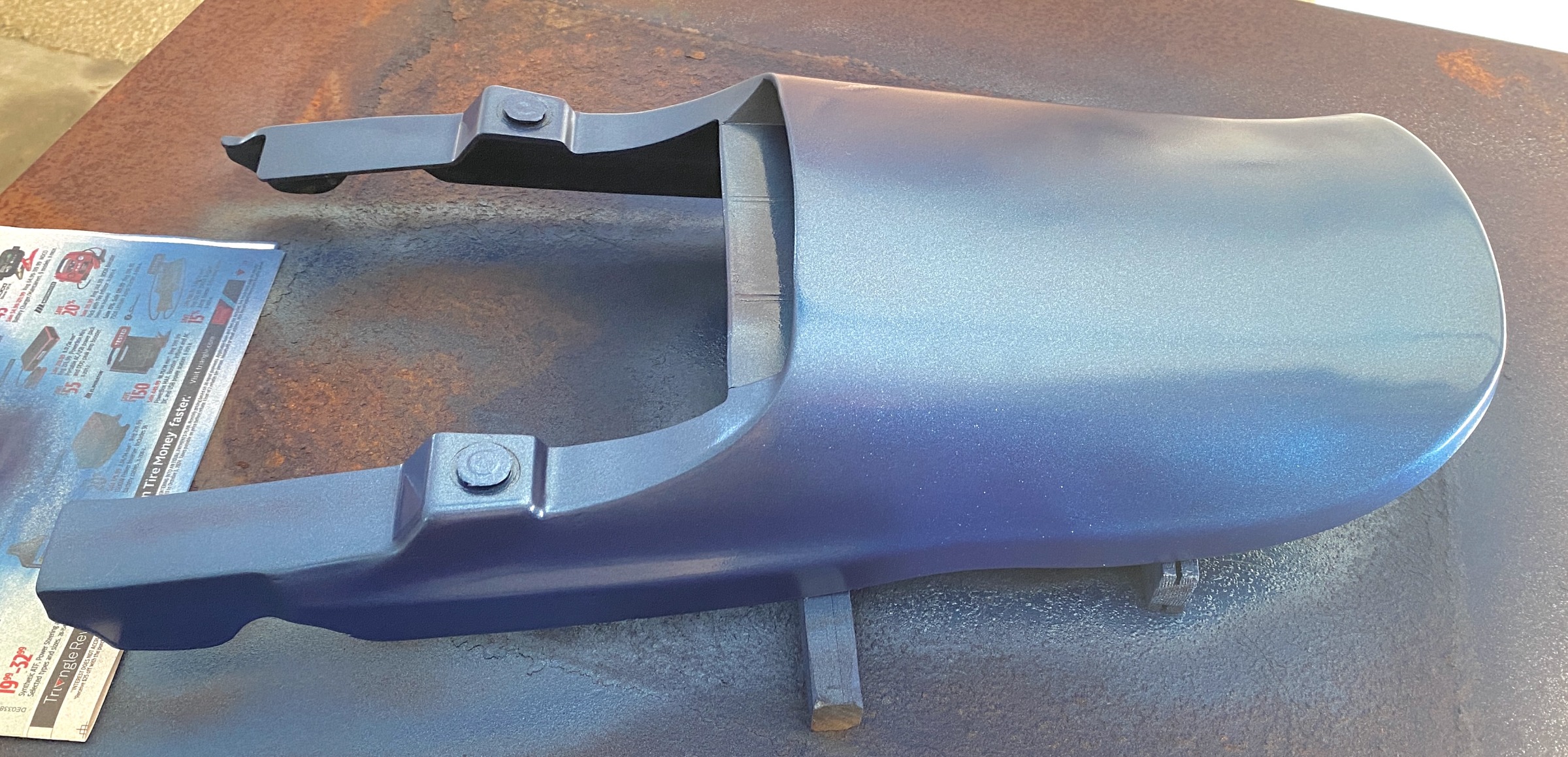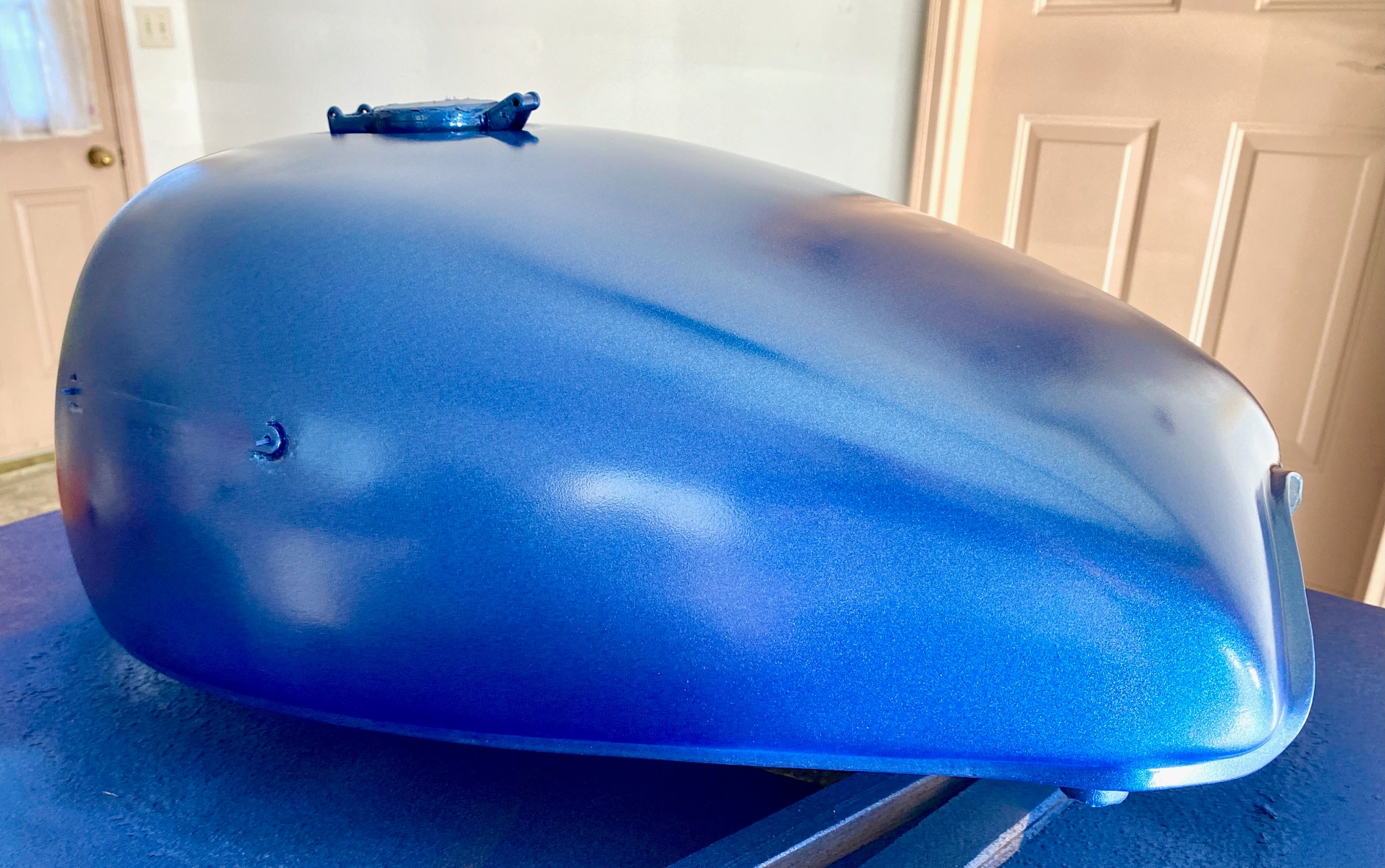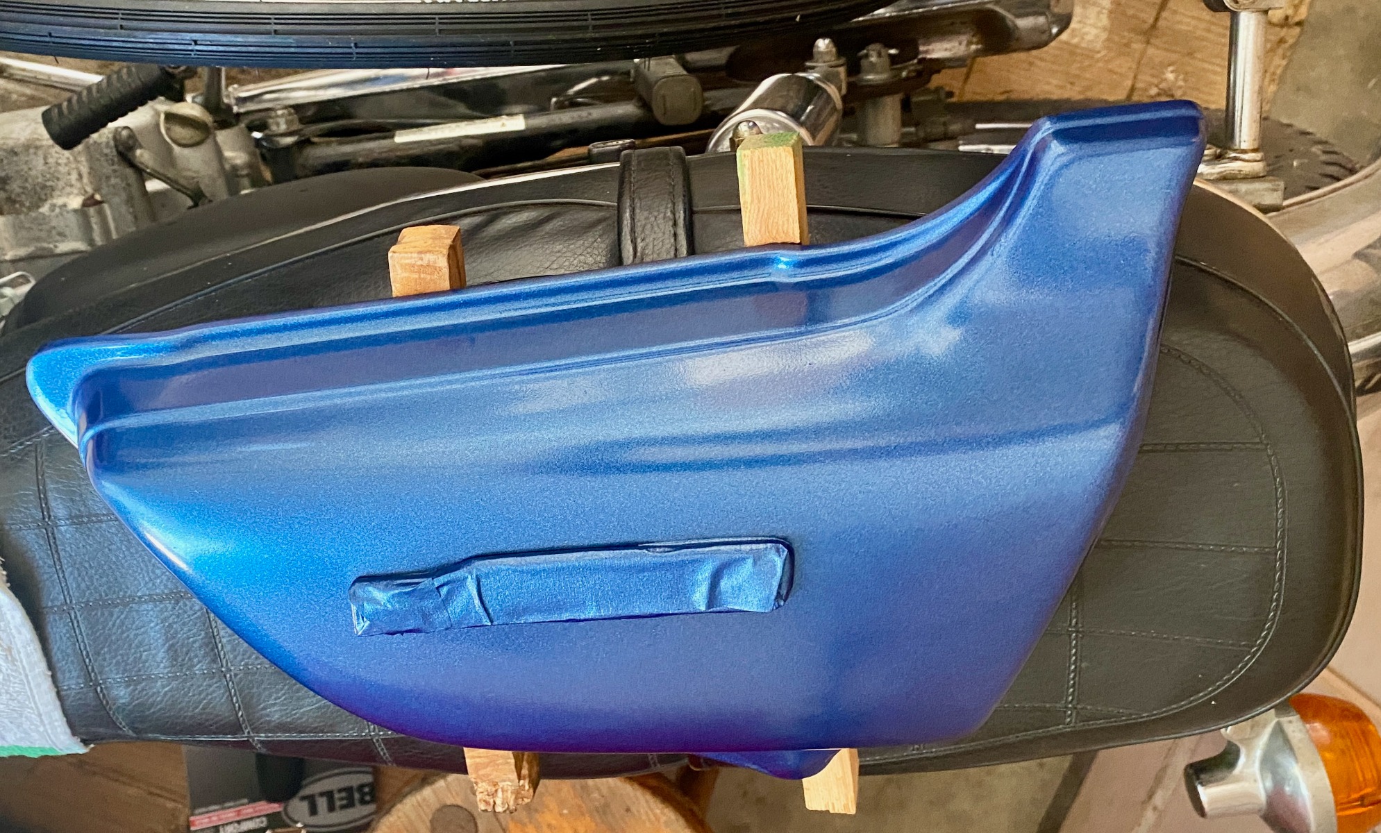 But it was time to rattle the can of RustOleum Blue Cobalt Metalflake,....... and accept the results. This is of course not a Kawasaki color, but it might suit the period. I joke that it is Jimi Hendrix Purple !!