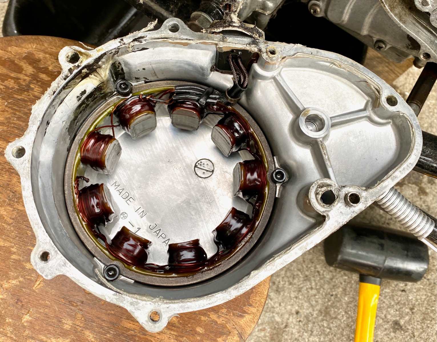 A bit of rubber mallet action loosened the generator cover from is dowels and goop sealant. And the sprocket cover was removed to keep track of the stator wiring.