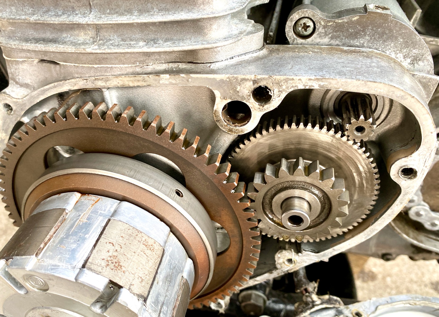 Somewhere in the history of time the engine's generator cover was installed without a gasket and with a smear of unidentifiable goop. This was a bit worrisome as the axial play of the starter intermediate gear is controlled by how close the cover is to the crankcase.